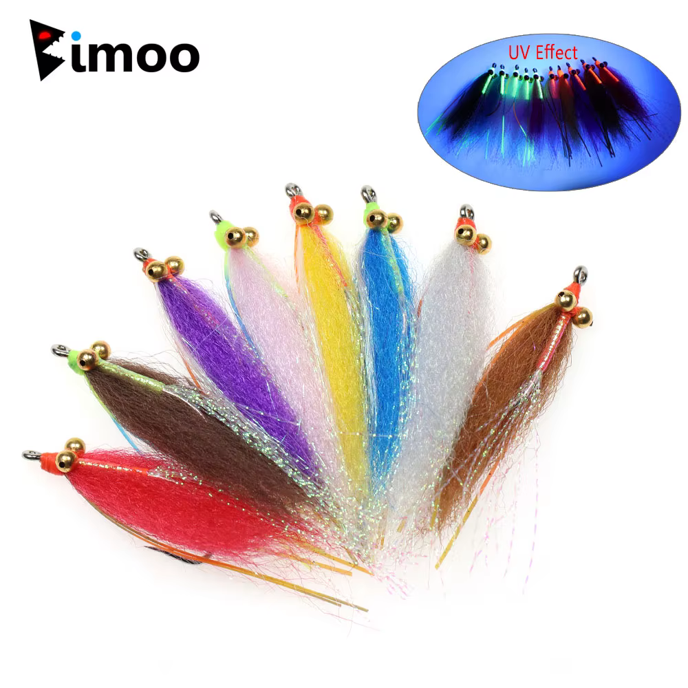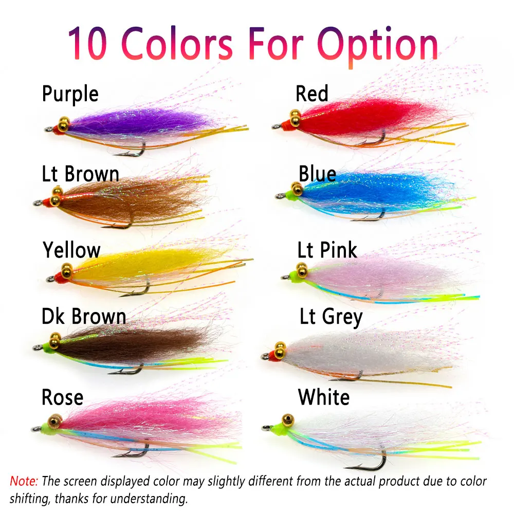 Bimoo 10 piezas#4~#2/0 EP Cadena de fibra sedosa Ojos locos Charlie Fly Barbed Fly Hook Ahuadero rápido Bonefish Permit Tarpon Señuelos de pesca de agua salada