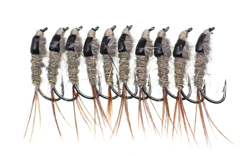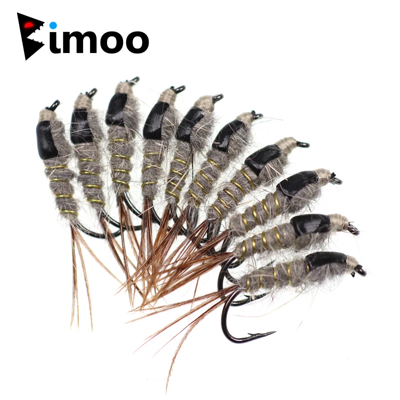 Bimoo, 10 Uds., tamaño 12, gris, negro, cola de faisán, pluma, oreja de liebre, ninfa, mosca, trucha, grilismo, Panfish, pesca, señuelo clásico con mosca