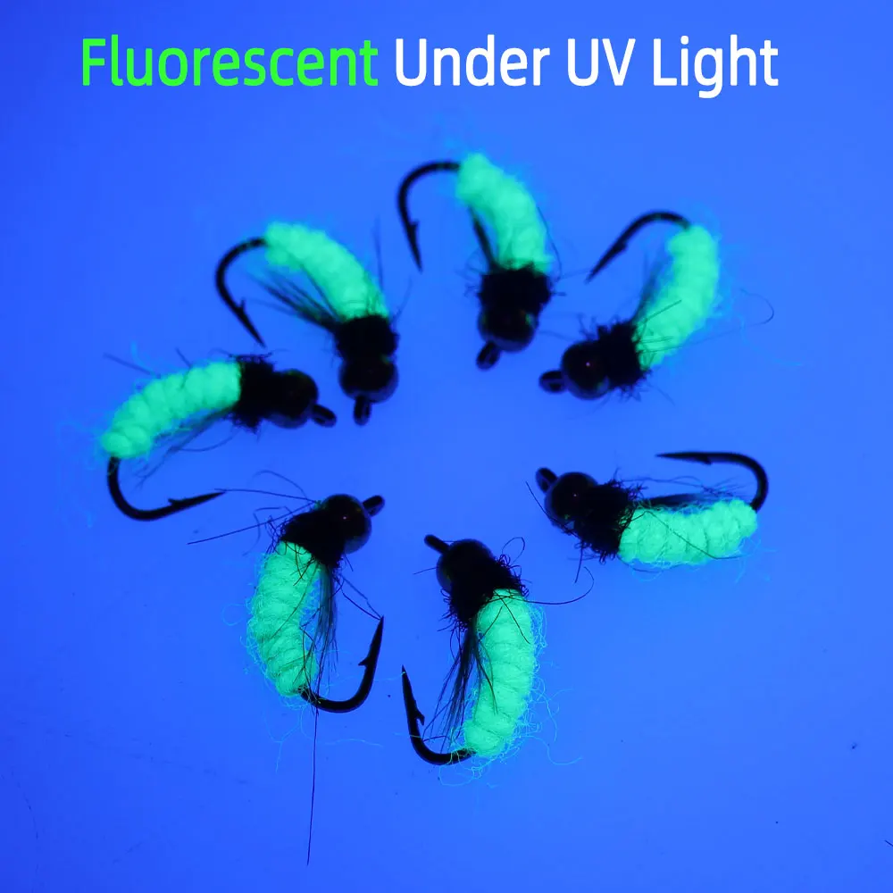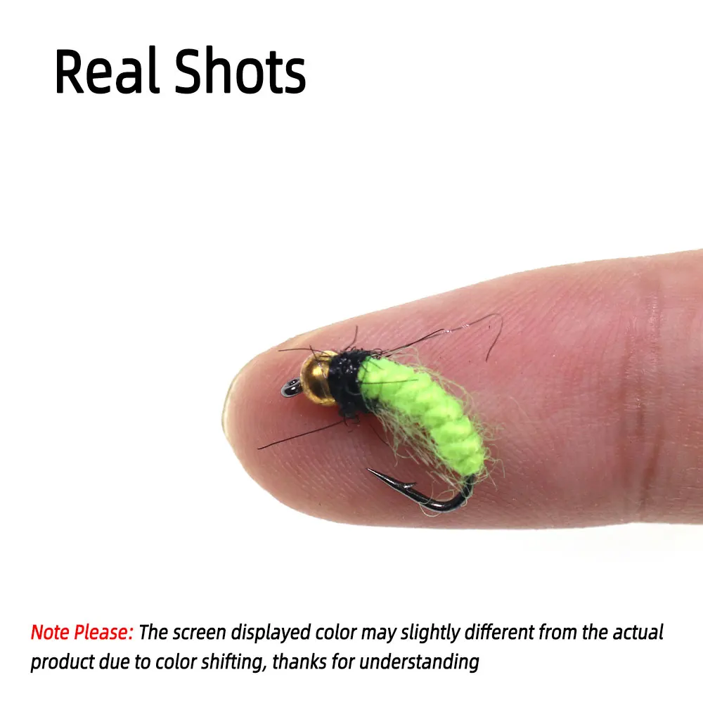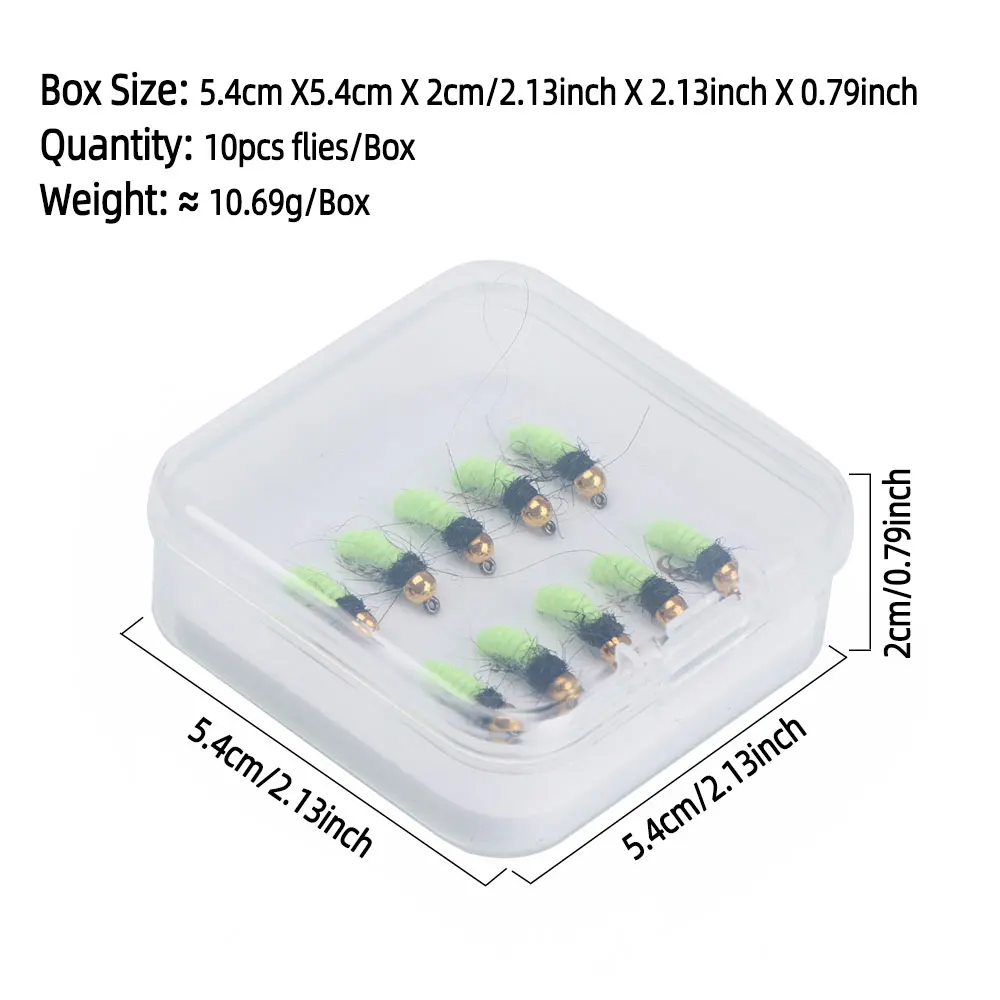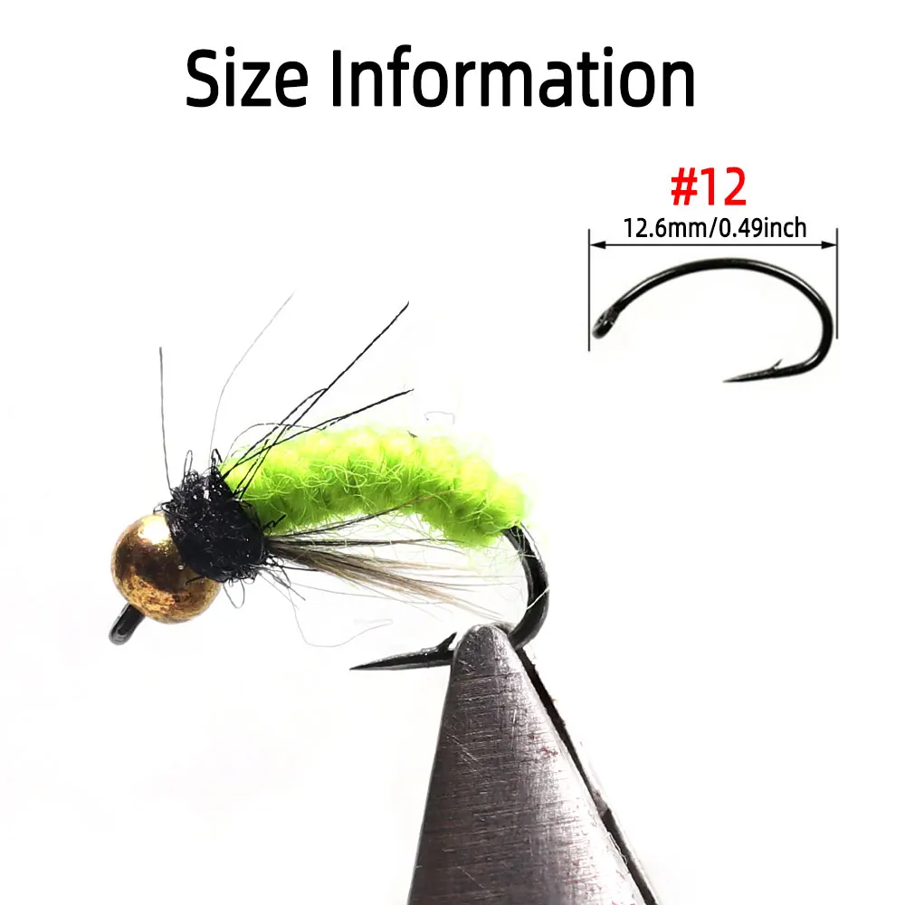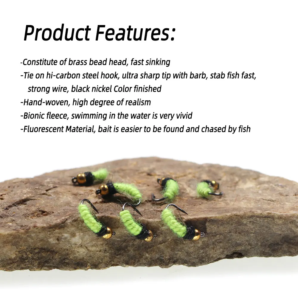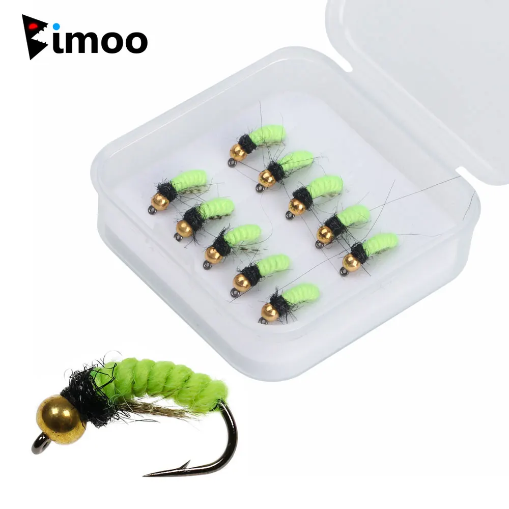Bimoo 10 unids/caja #12 Ninfa fluorescente Scud Bug Worm Fly hundimiento rápido cabeza de cuentas de latón moscas húmedas trucha Grayling cebo de pesca señuelo