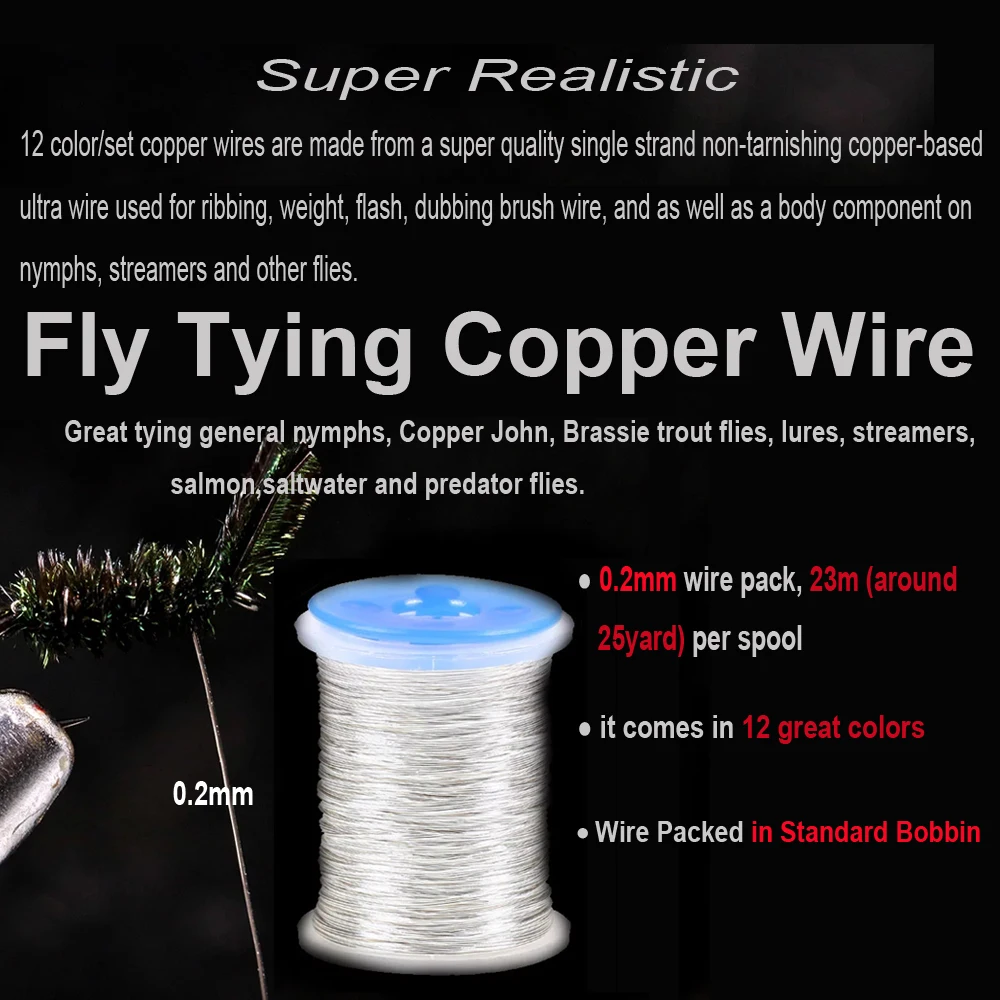 Bimoo-Juego de 12 colores de alambre de cobre para atar moscas, material para acanalar peso, cepillo de doblaje, ninfas, serpentina, trucha, moscas, alambre de salmón