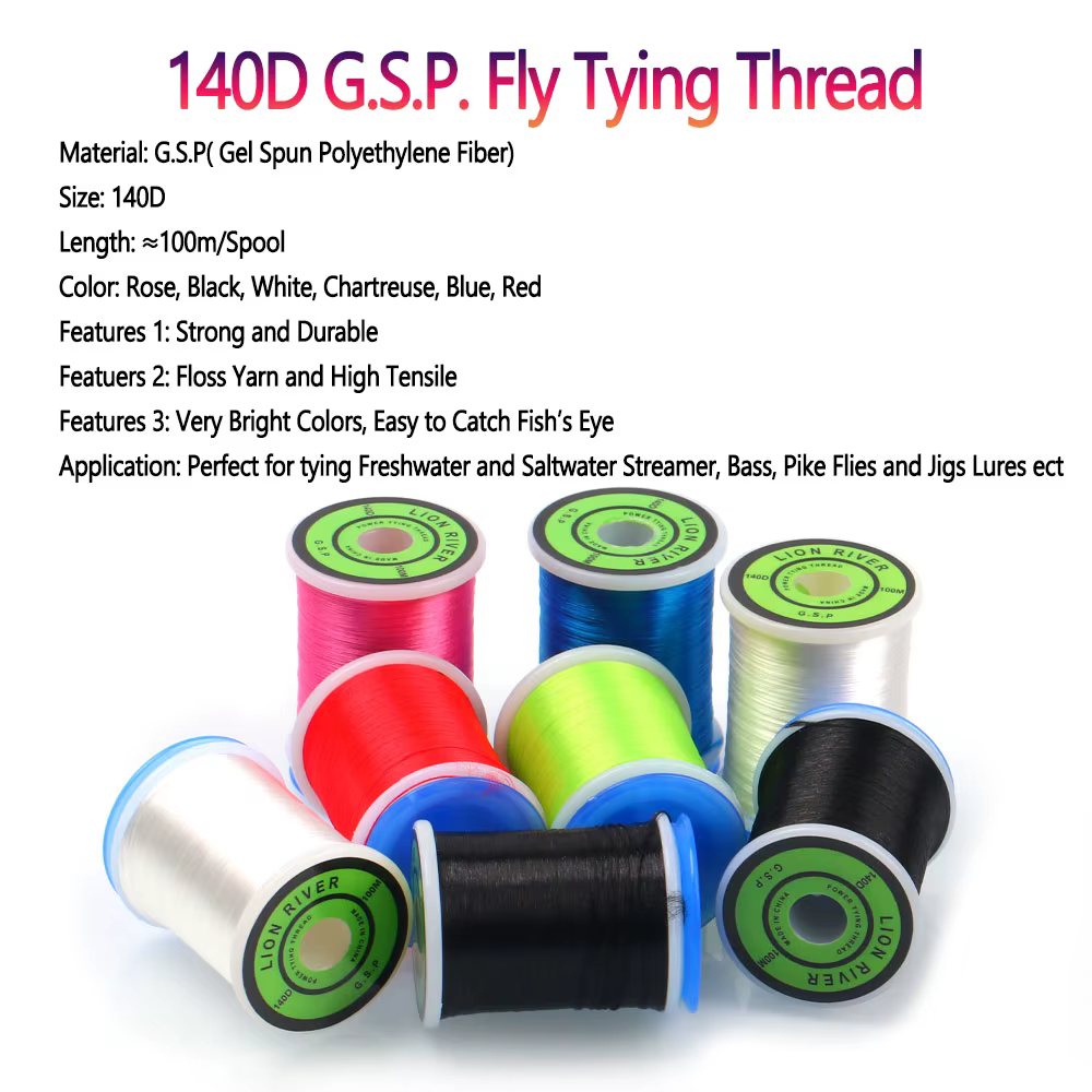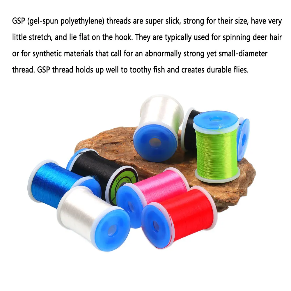 GSP (gel-spun polyethylene) threads are super slick, strong for their size, have very little stretch, and lie flat on the hook. They are typically used for spinning deer hair or for synthetic materials that call for an abnormally strong yet small-diameter thread. GSP thread holds up well to toothy fish and creates durable flies.