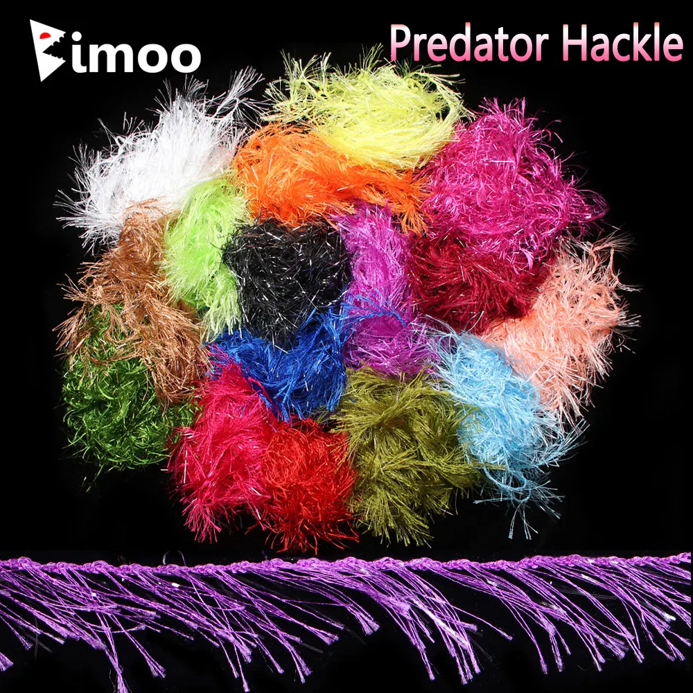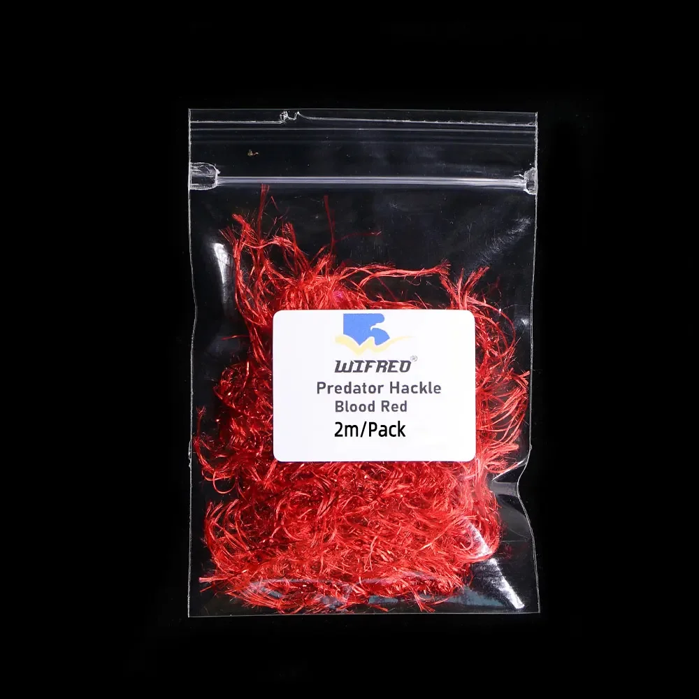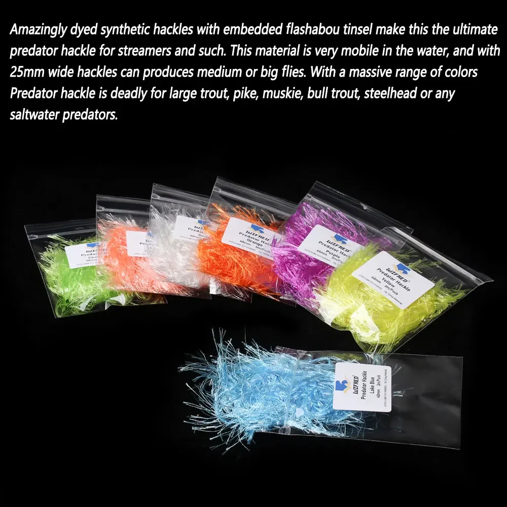 Los hackles sintéticos increíblemente teñidos con oropel flashabou incrustado hacen de este el mejor hackle predador para serpentinas y tales.Este material es muy móvil en el agua y con hackles de 25 mm de ancho se pueden producir moscas medianas o grandes.Con una enorme gama de colores Predator hackle es mortal para truchas grandes, lucios, almizcles, truchas toro, truchas steelhead o cualquier depredador de agua salada.