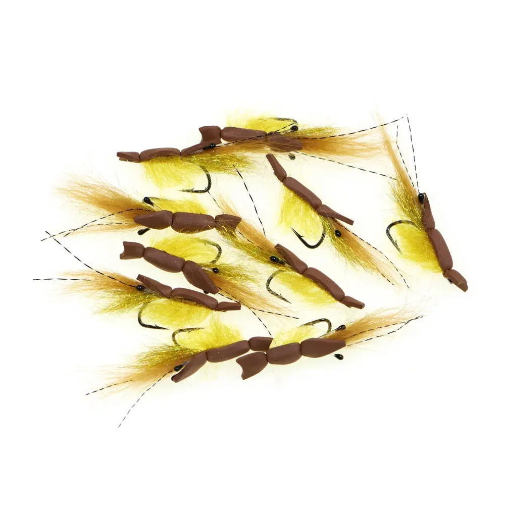 Una mosca de espuma para camarones es un señuelo de pesca popular diseñado para imitar la apariencia y el movimiento de los camarones en el agua.El material de espuma permite que la mosca flutue o luche, lo que la hace atractiva para pescar.Es particularmente eficaz para capturar especies como gallos rojos, lucios, snooks y trucha marina debido a su diseño realista y su acción de hundimiento lento.