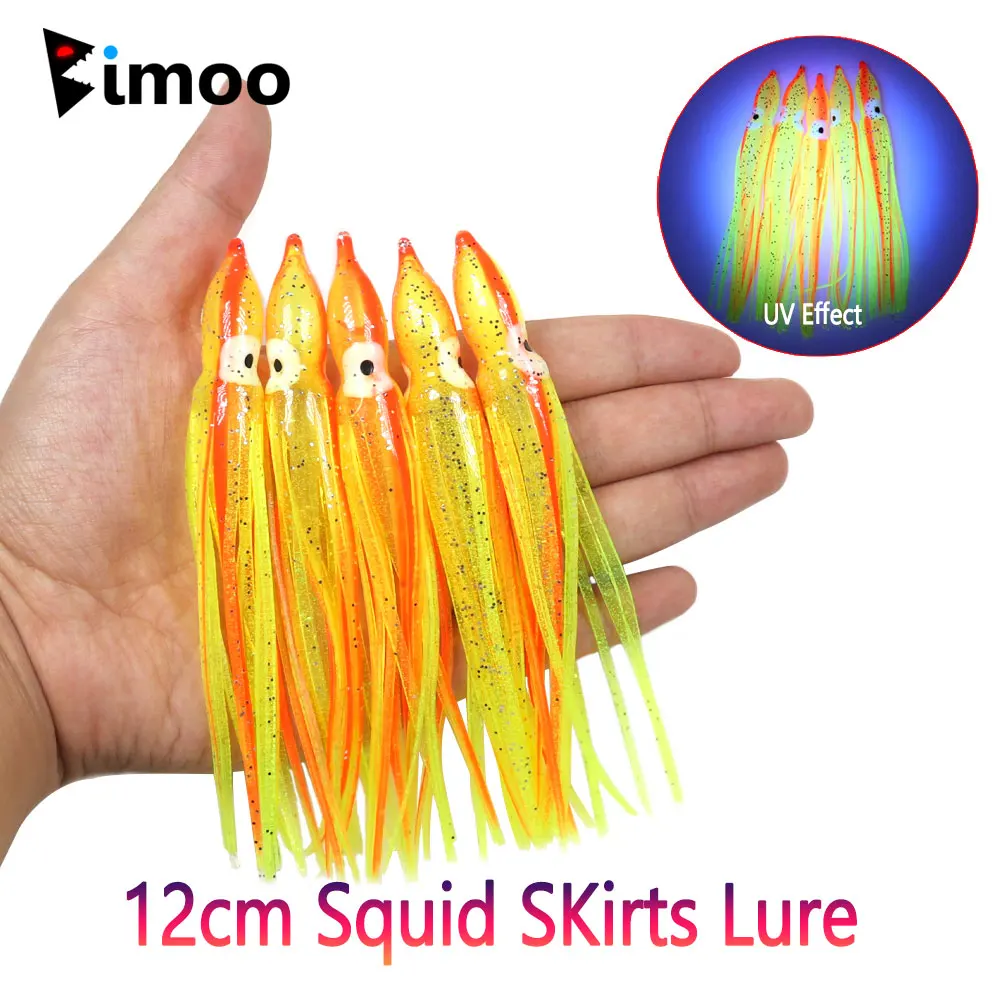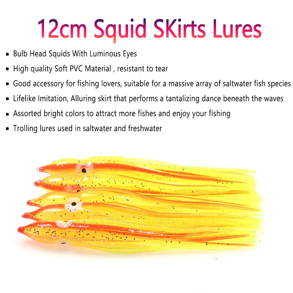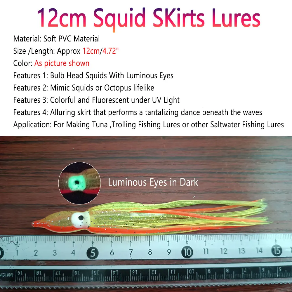 Bimoo 2 bolsas=10 Uds. Calamares con cabeza de bombilla de 12cm con ojos luminosos faldas de calamar suaves señuelos falda de pulpo señuelos de pesca de agua salada cebos