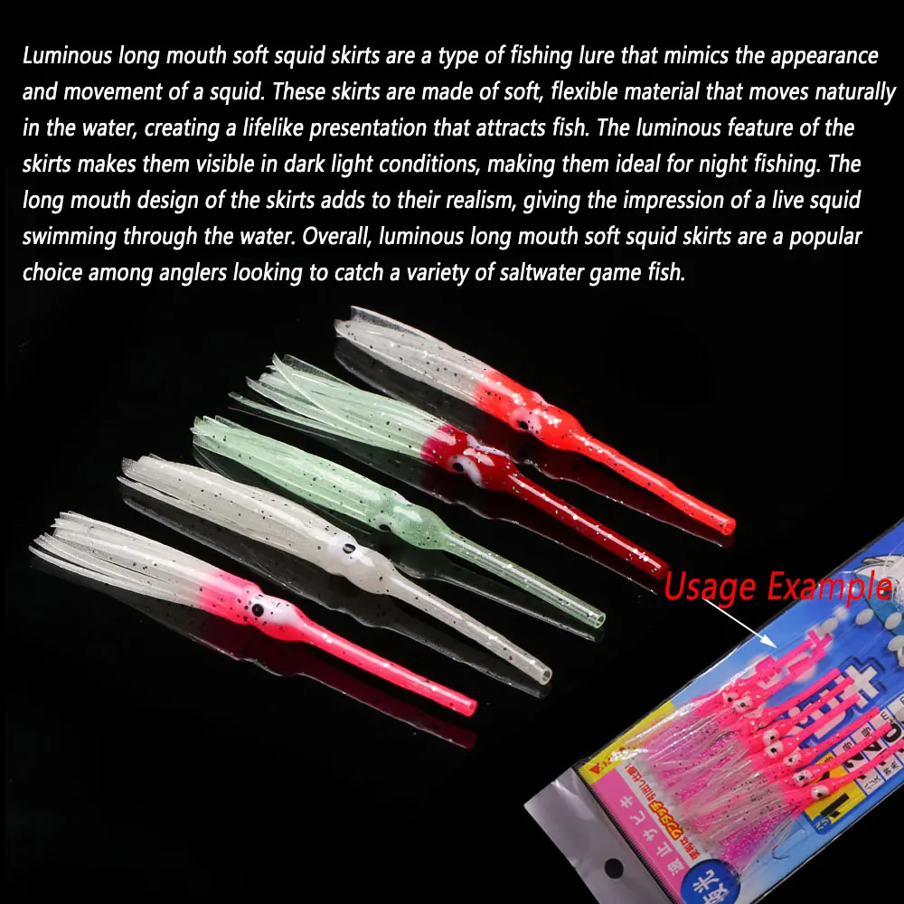 Las faldas luminosas de calamar de boca larga son un tipo de señuelo de pesca que imita la apariencia y el movimiento de un calamar.Estas faldas están hechas de un material suave y flexible que se mueve naturalmente en el agua, creando una presentación realista que atrae a los peces.La característica luminosa de las faldas las hace visibles en condiciones de luz oscura, lo que las hace ideales para la pesca nocturna.El diseño de boca larga de las faldas aumenta su realismo, dando la impresión de un calamar vivo nadando por el agua.En general, las faldas luminosas de calamar suaves de boca larga son una opción popular entre los pescadores que buscan pescar una variedad de peces de caza de agua salada.