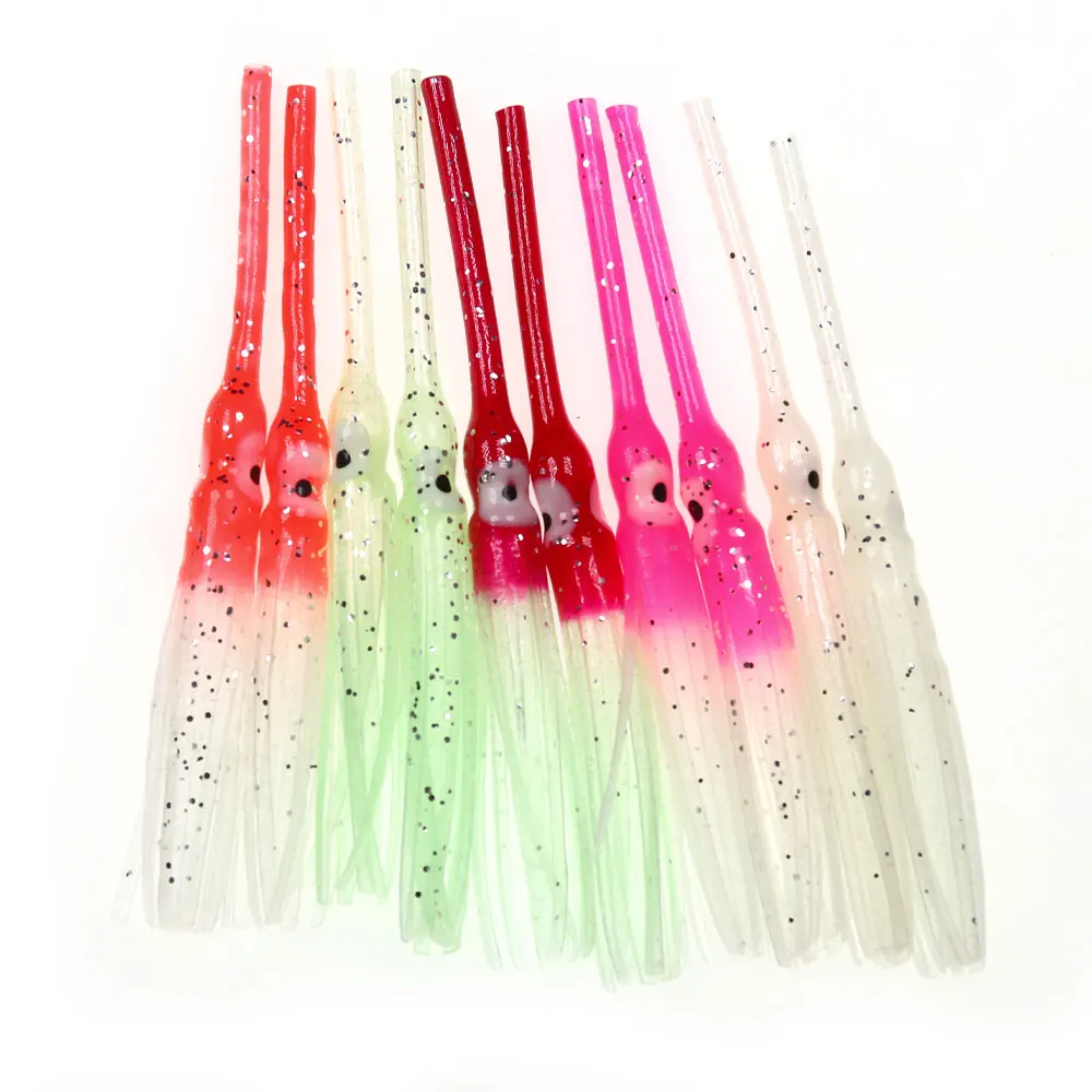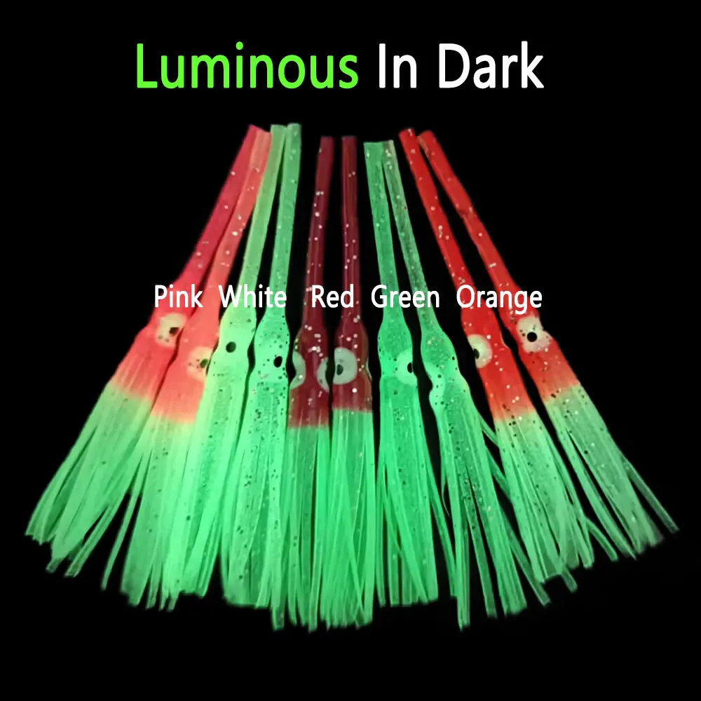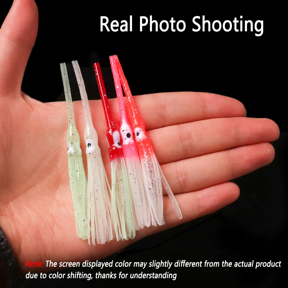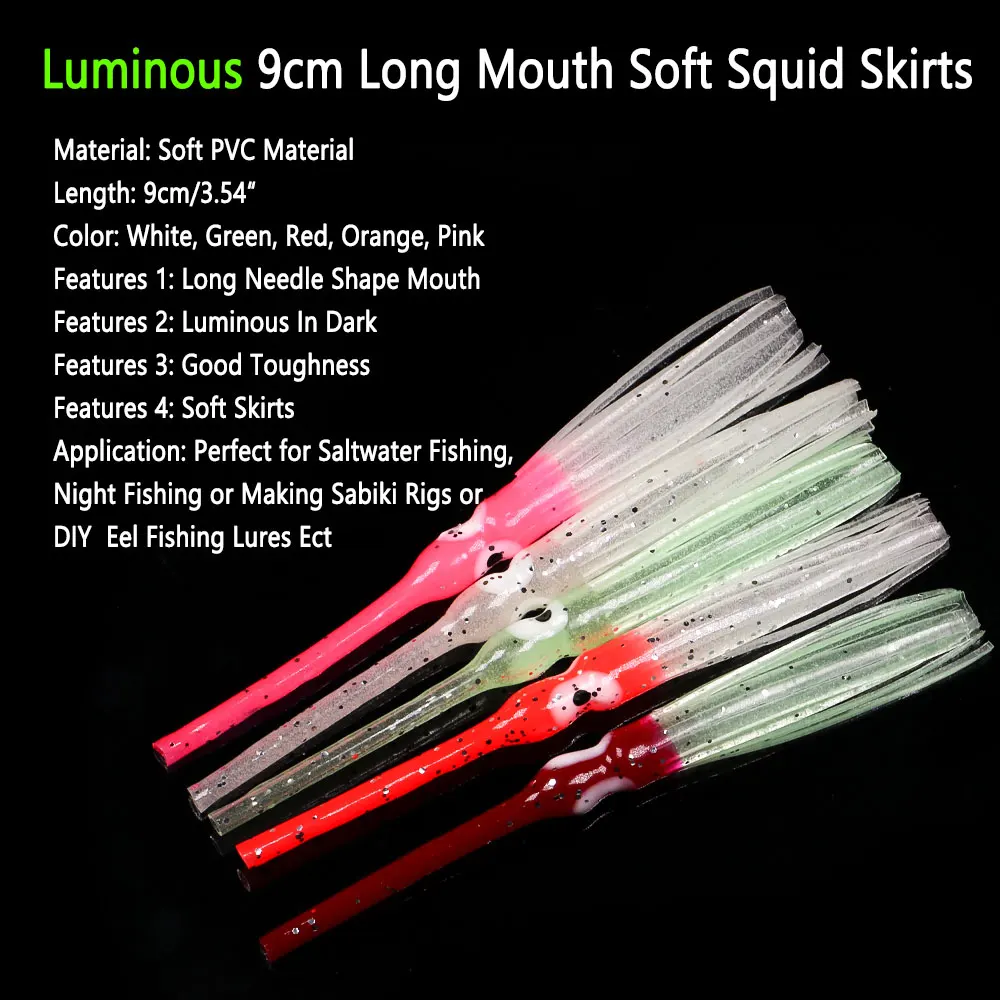 Bimoo 2 bolsas=20 piezas luminosas de 9 cm de boca larga faldas de calamar suaves falda de pulpo Señuelos de pesca de mar cebos Sabiki aparejo Señuelos de anguilo de pesca