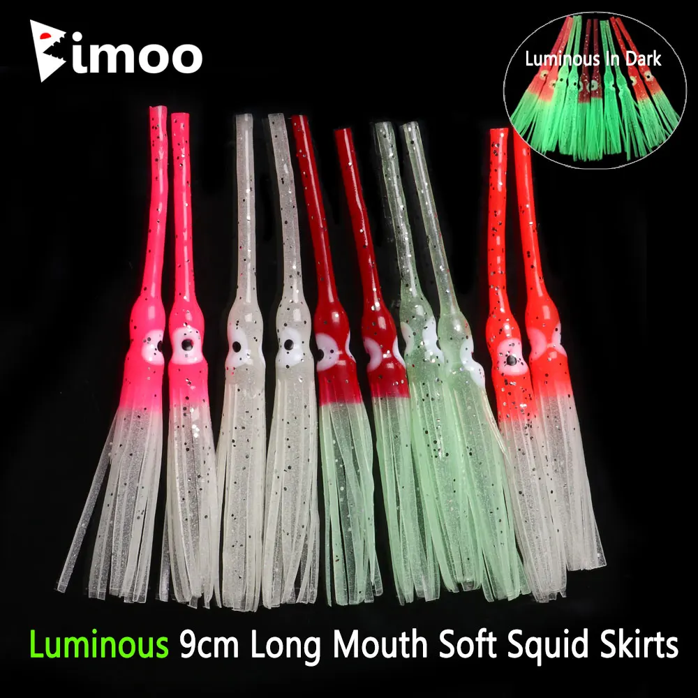 Bimoo 2 bolsas=20 piezas luminosas de 9 cm de boca larga faldas de calamar suaves falda de pulpo Señuelos de pesca de mar cebos Sabiki aparejo Señuelos de anguilo de pesca