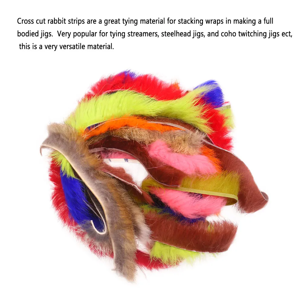 Las tiras de conejo de corte cruzado son un gran material de atado para apilar envolturas al hacer plantillas de cuerpo completo. Muy popular para atar serpentinas, jigs de cabeza de acero y jigs de contracción coho, este es un material muy versátil.