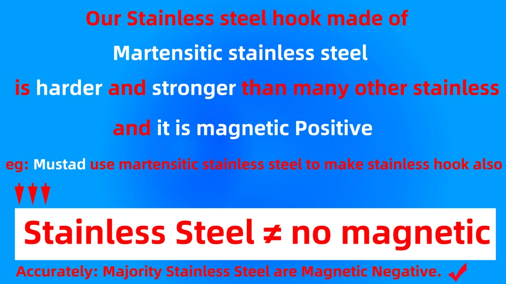 1. Made of Stainless Steel 420, High strength and corrosion resistance;(Please test this hook and non-stainless steel hook in seawater at the same time to determine its material, instead of using magnets. Thanks~)