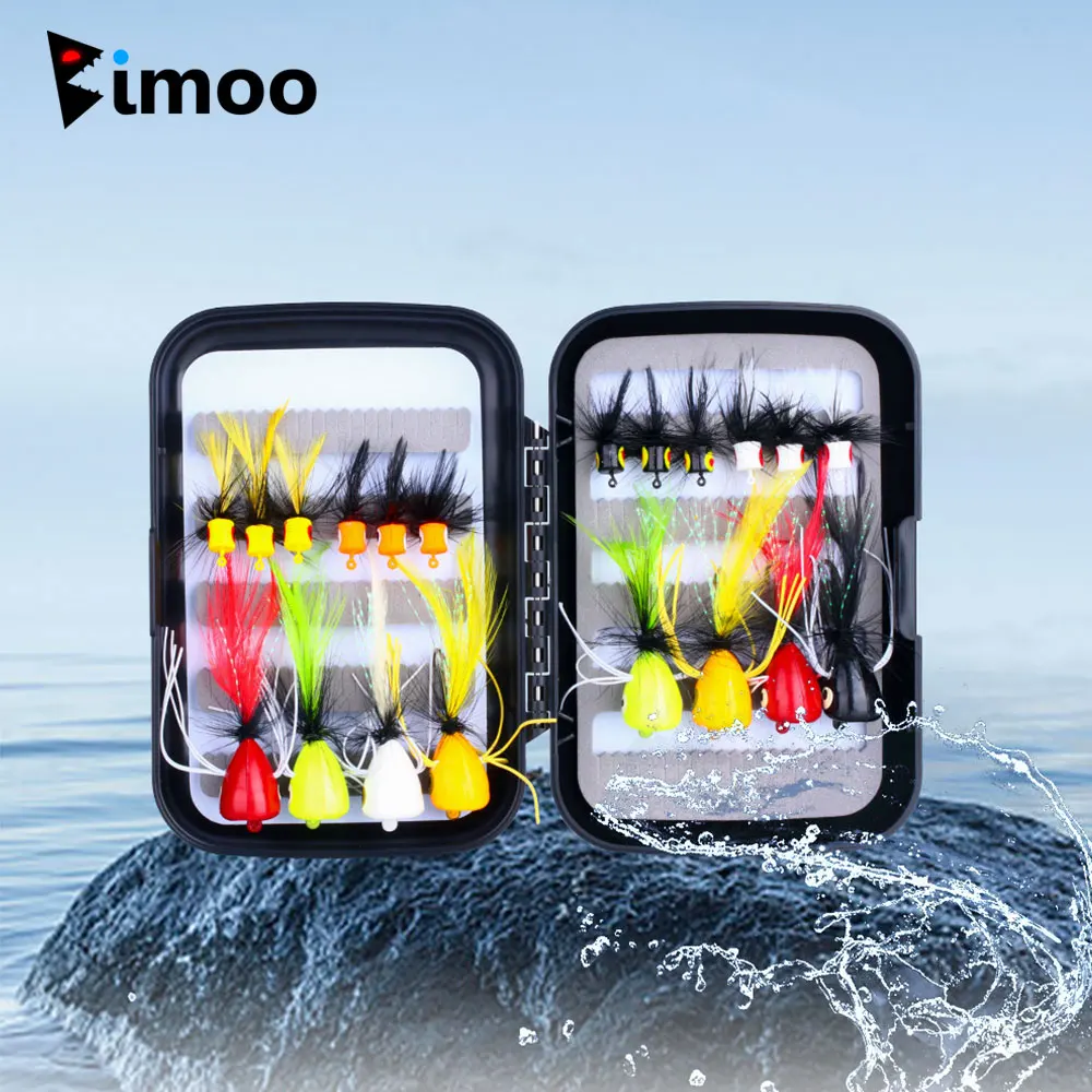 Bimoo 20 unids/caja Topwater Kit de poppers de pesca con mosca cebos artificiales para insectos flotantes moscas secas insectos lubina trucha salmón señuelo de pesca
