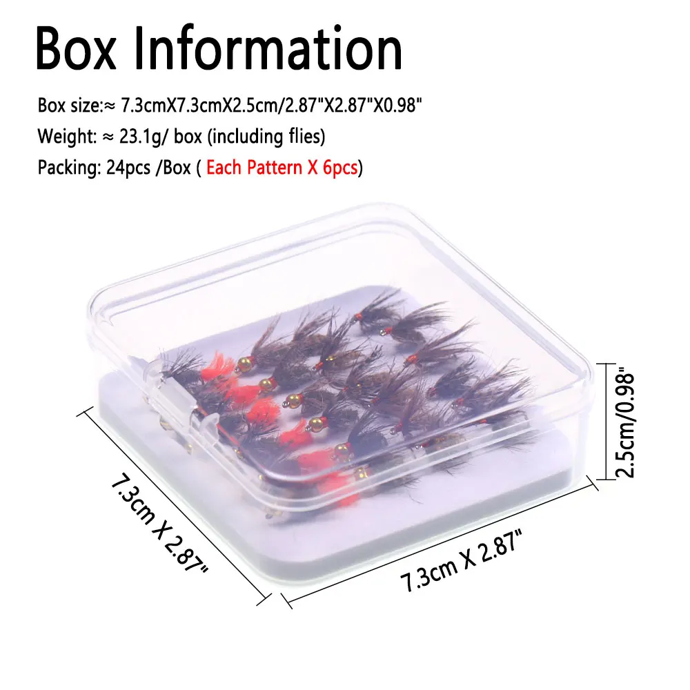 Peso: ≈ 23,1 g/caja (incluidas las moscas)