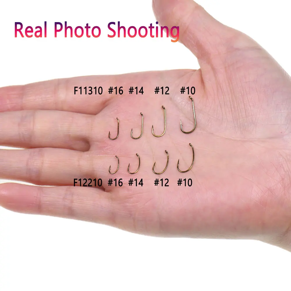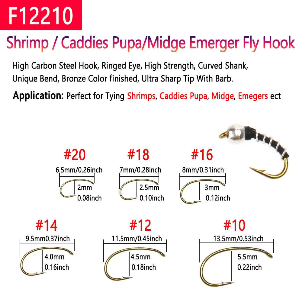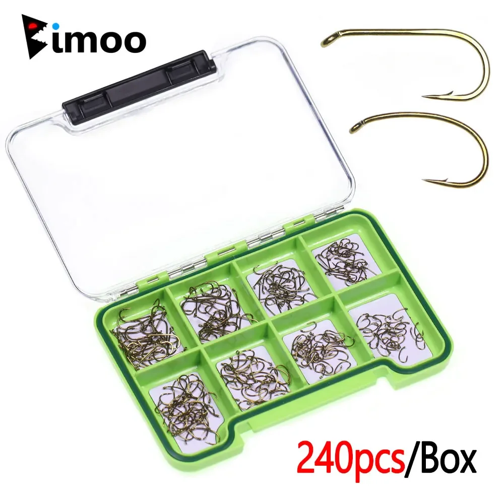 Bimoo 240 unids/caja de acero con alto contenido de carbono, anzuelo para atar moscas secas con púas, Caddies para camarones, Pupa/Midge, anzuelo para moscas, señuelos de pesca para trucha