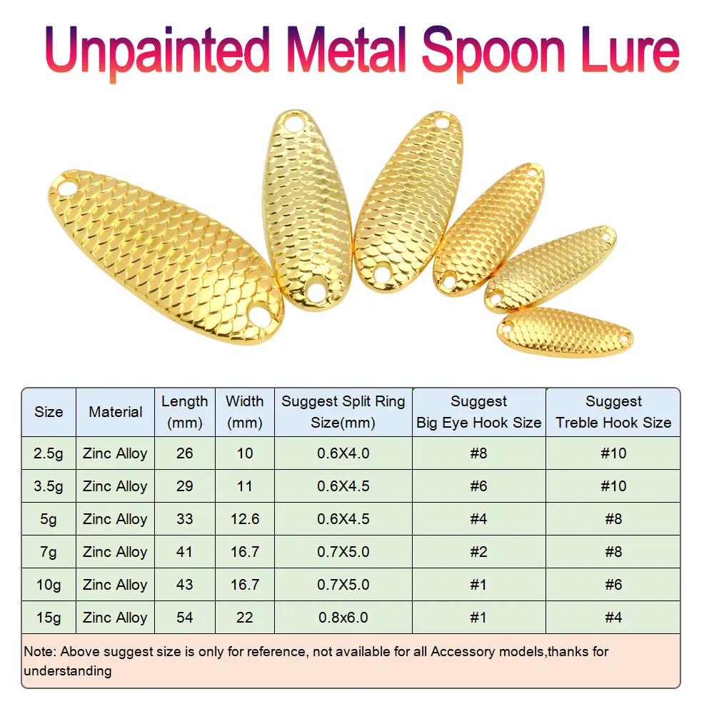 Aplicación: Normalmente las cucharas combinan con un anzuelo de ojo grande y un anzuelo triple o cebos de pesca de bricolaje.Perfecto para pescar trucha, lucio, perca, lubina, almizclero, stripper, pez, etc.