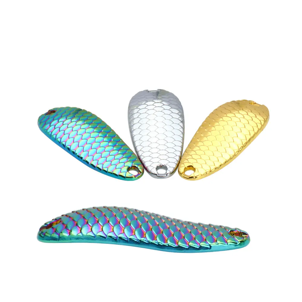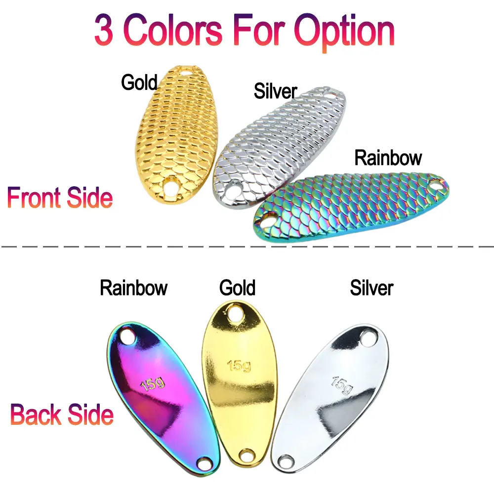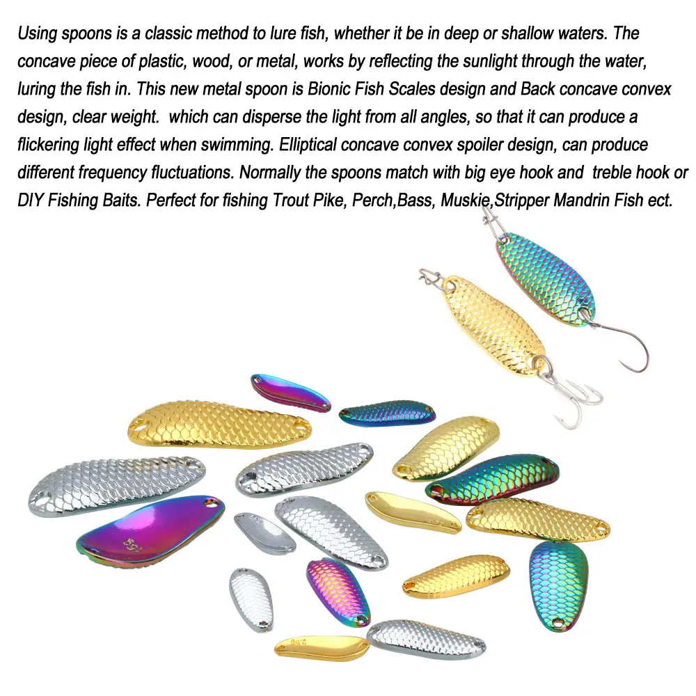 El uso de cucharas es un método clásico para atraer peces, ya sea en aguas profundas o poco profundas.La pieza cóncava de plástico, madera o metal funciona reflejando la luz del sol a través del agua, atrayendo a los peces.Esta nueva cuchara de metal tiene un diseño de escamas de pescado biónicas y un diseño cóncavo y convexo posterior, peso claro.que puede dispersar la luz desde todos los ángulos, de modo que pueda producir un efecto de luz parpadeante al nadar.El diseño de alerón convexo cóncavo elíptico puede producir diferentes fluctuaciones de frecuencia.Normalmente las cucharas combinan con un anzuelo de ojo grande y un anzuelo triple o con cebos de pesca de bricolaje.Perfecto para pescar trucha, lucio, perca, lubina, almizclero, stripper, pez, etc.