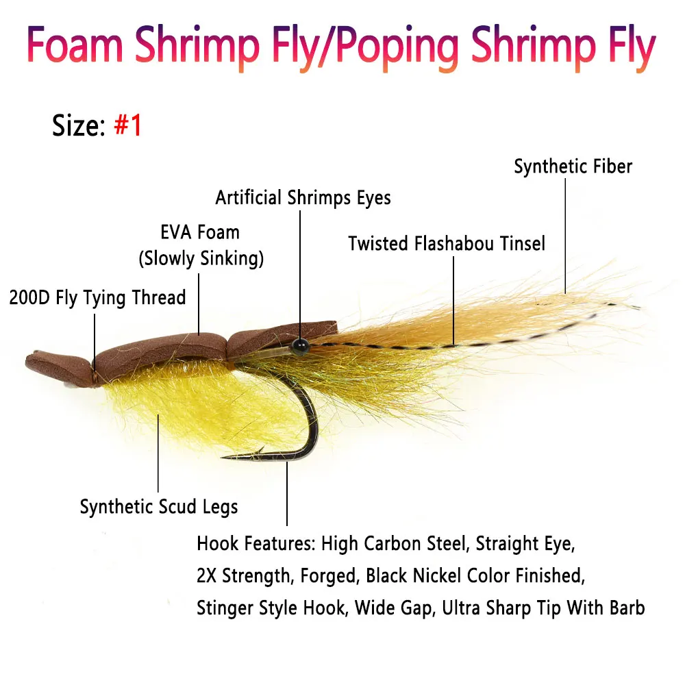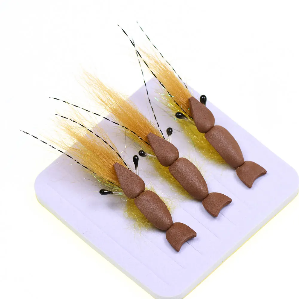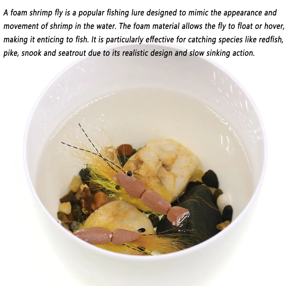 Una mosca de espuma para camarones es un señuelo de pesca popular diseñado para imitar la apariencia y el movimiento de los camarones en el agua.El material de espuma permite que la mosca flutue o luche, lo que la hace atractiva para pescar.Es particularmente eficaz para capturar especies como gallos rojos, lucios, snooks y trucha marina debido a su diseño realista y su acción de hundimiento lento.
