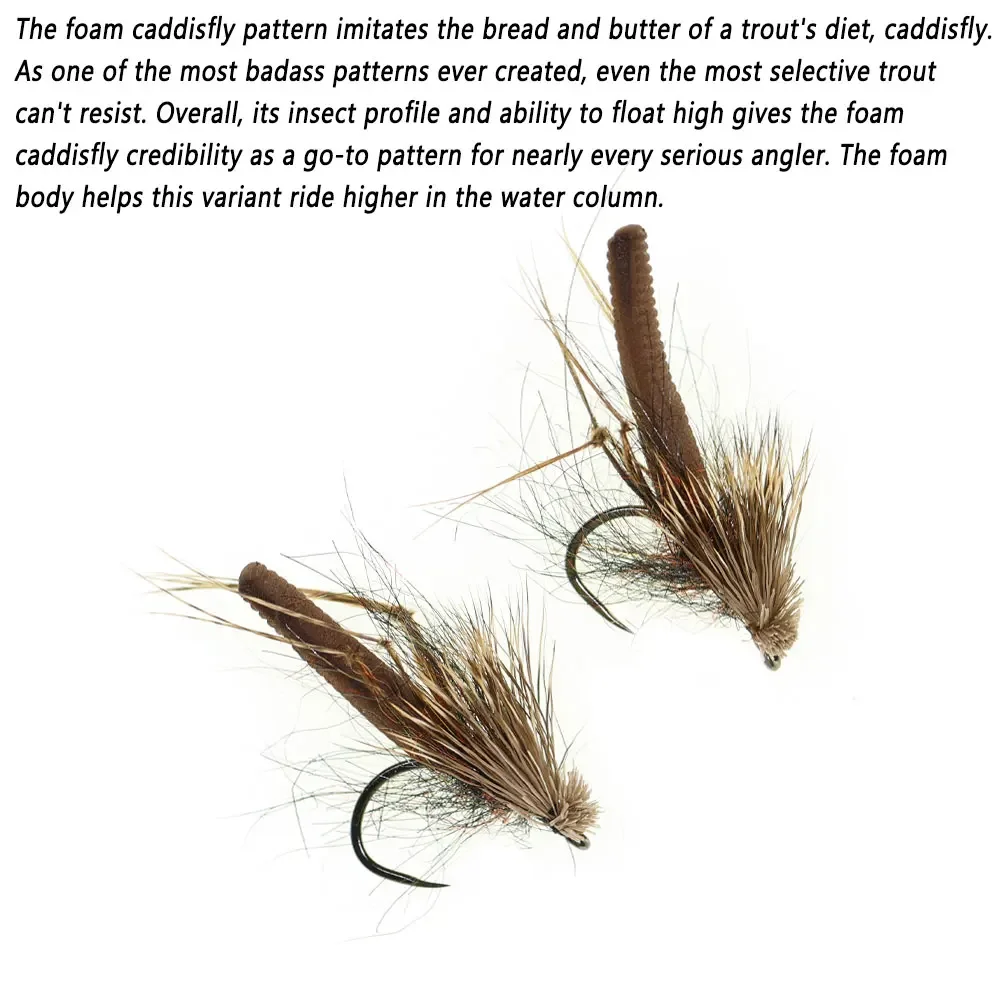 El patrón de caddisfly de espuma imita el pan y la mantequilla de la dieta de una trucha, caddisfly.Como uno de los patrones más duros jamás creados, ni siquiera la trucha más selectiva puede resistirse.En general, su perfil de insecto y su capacidad de flotar alto le dan a la creíble caddisfly de espuma como un patrón ideal para casi todos los pescadores serios.El cuerpo de espuma ayuda a esta variante a volcar más alto en la columna de agua.