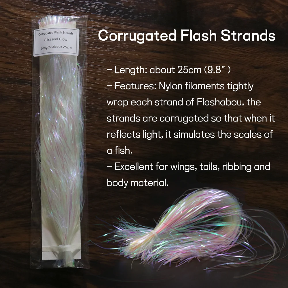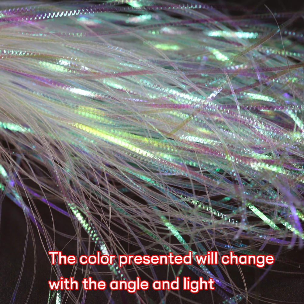 Características: Los filamentos de nailon envuelven firmemente cada hilo de Flashabou, los hilos están corrugados de modo que cuando refleja la luz simule las escamas de un pez.Excelente para alas, colas, nervaduras y material del cuerpo.