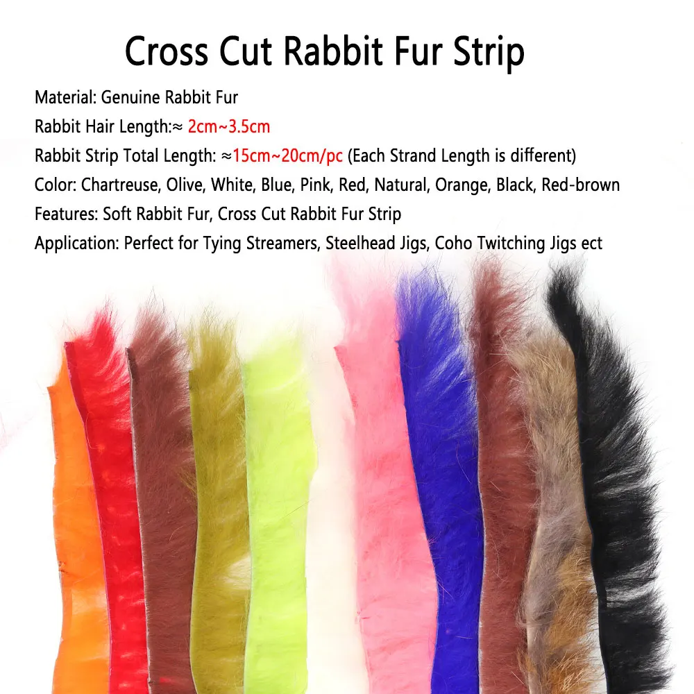 Las tiras de conejo de corte cruzado son un excelente material para atar para apilar envolturas al hacer plantillas con mucho cuerpo.Muy popular para atar serpentinas, plantillas de cabeza de acero y plantillas de contracción coho, etc., este es un material muy versátil.