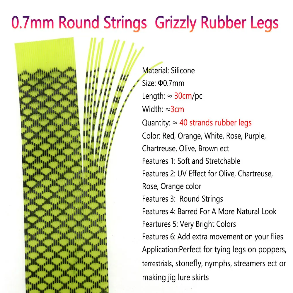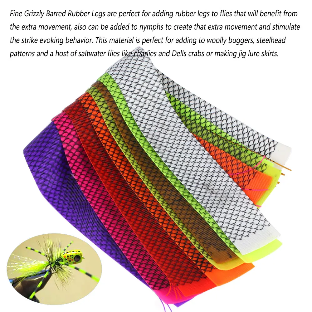 Características del producto: Las patas de goma con púas finas y agrícolas son perfectas para agregar patas de goma a las moscas que se beneficiarán del movimiento adicional, también se pueden agregar a ninfas para crear ese movimiento adicional y estimular el comportamiento de evocación de golpes.Este material es perfecto para agregar a buggers lanudos, patrones de bolas de acero y una gran cantidad de moscas de agua salada como charli y cangrejos Dells o para hacer faldas con señuelo jig.