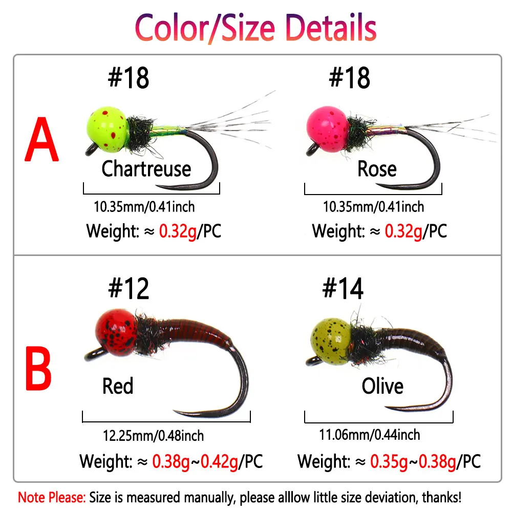 Peso de la mosca: Tamaño 12 ≈ 0,35 g ~ 0,38 g/unidad