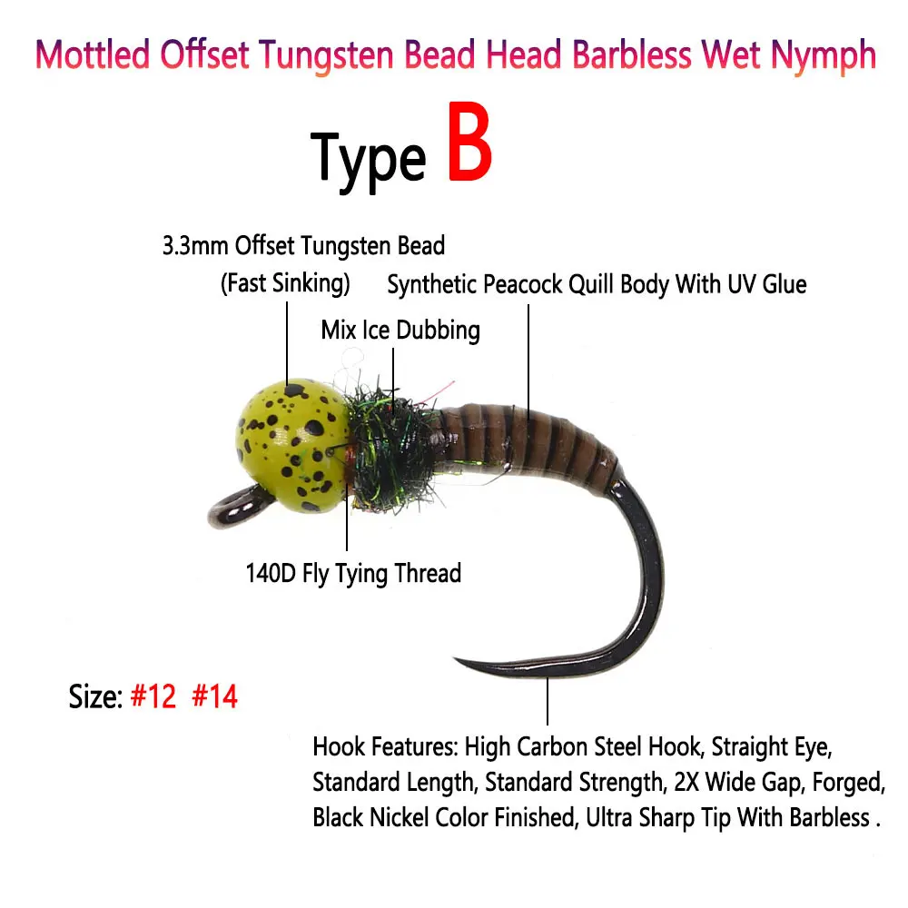 Cabeza de cuentas de tungsteno offset burbujeada, mosca ninfa húmeda sin púas, tipo B