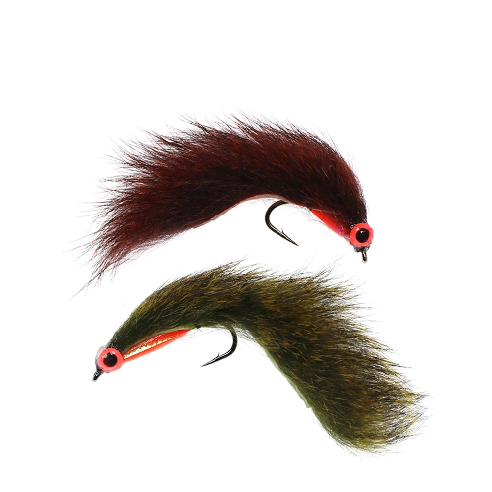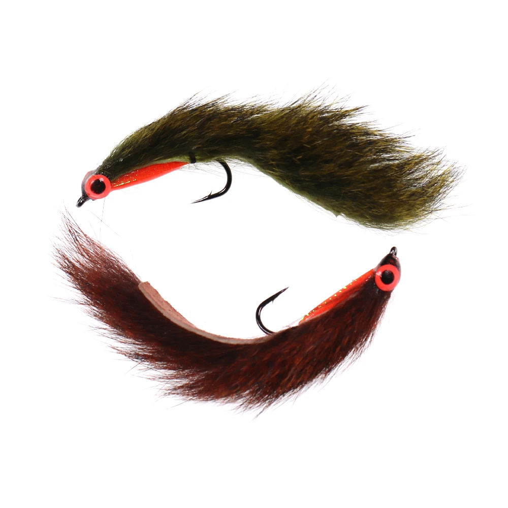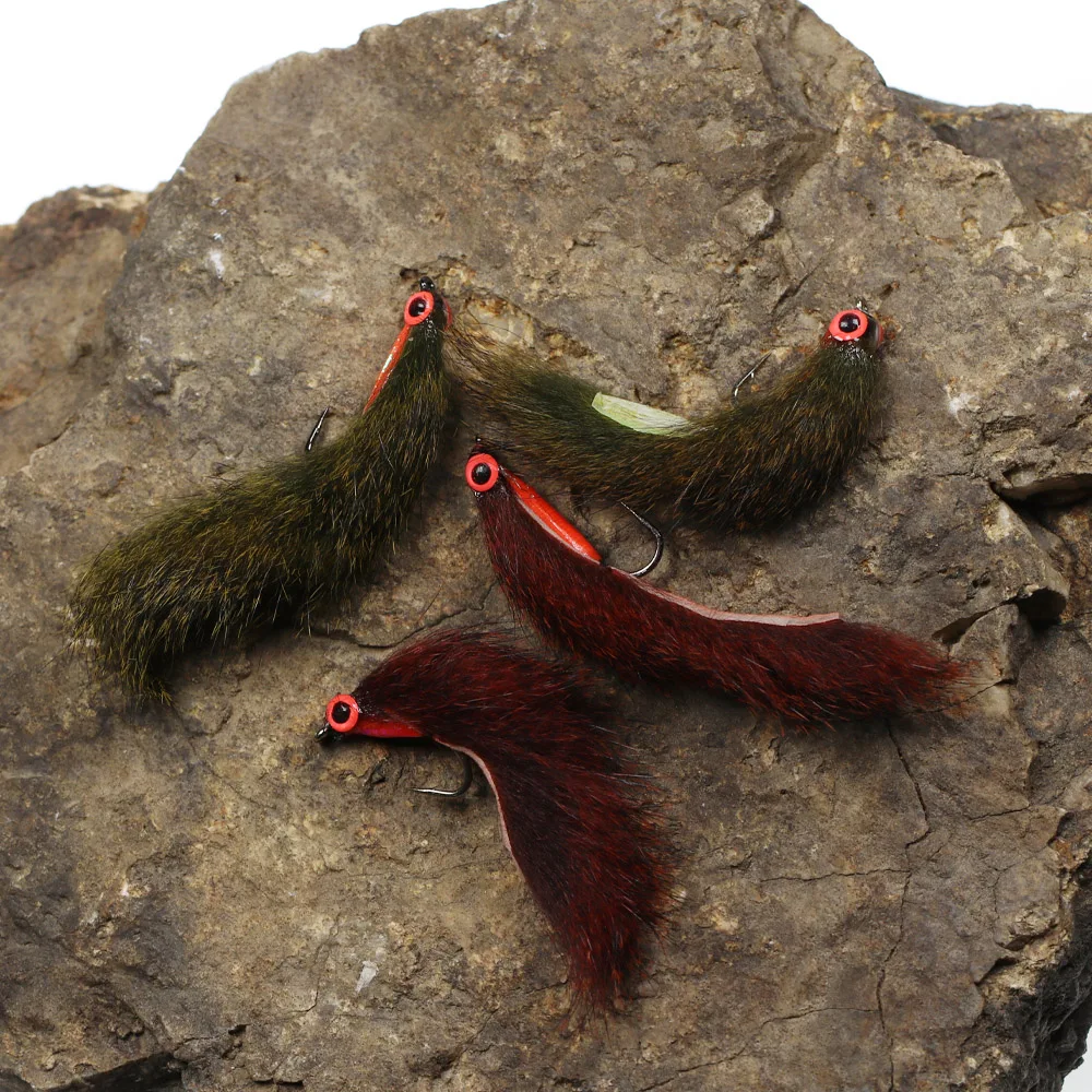 Bimoo 4 piezas#6#8 tiras de ardilla UV Zonker Streamer mosca oliva y rojo marrón cabeza de acero lubina trucha Lucio señuelo de pesca de agua salada