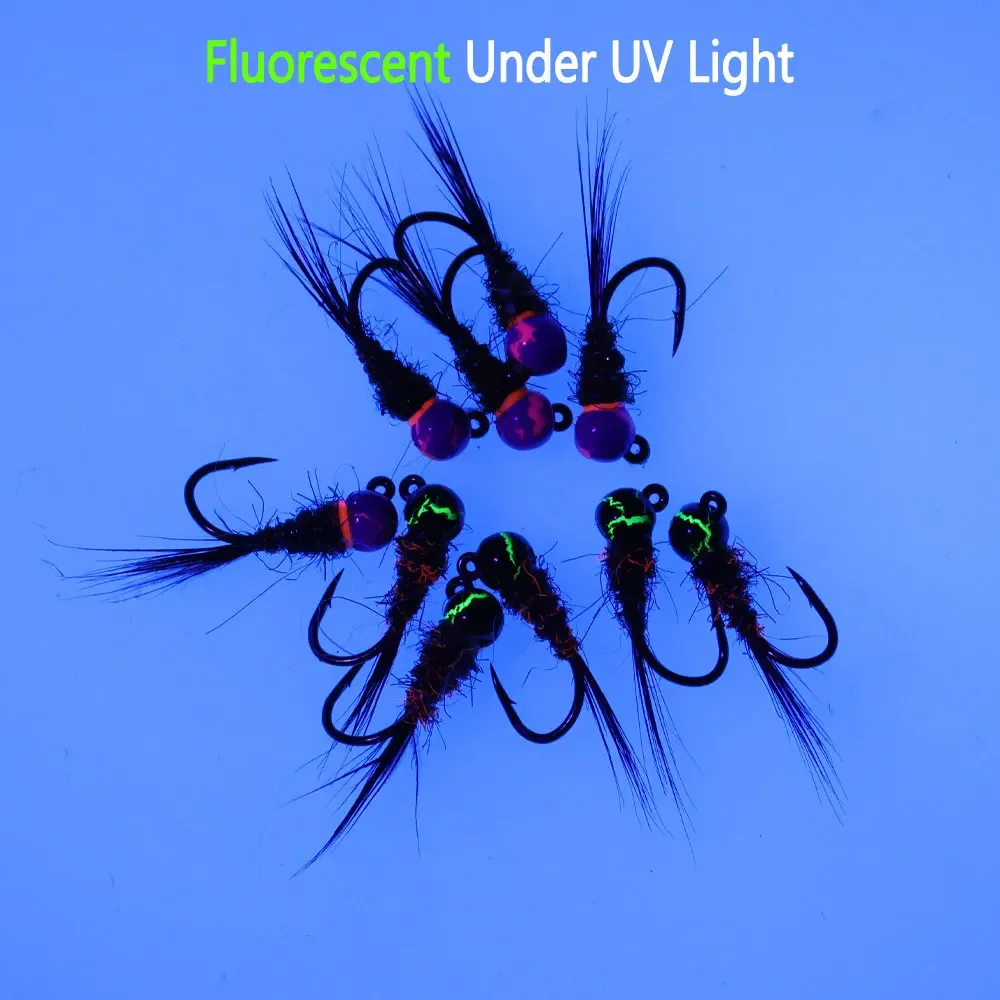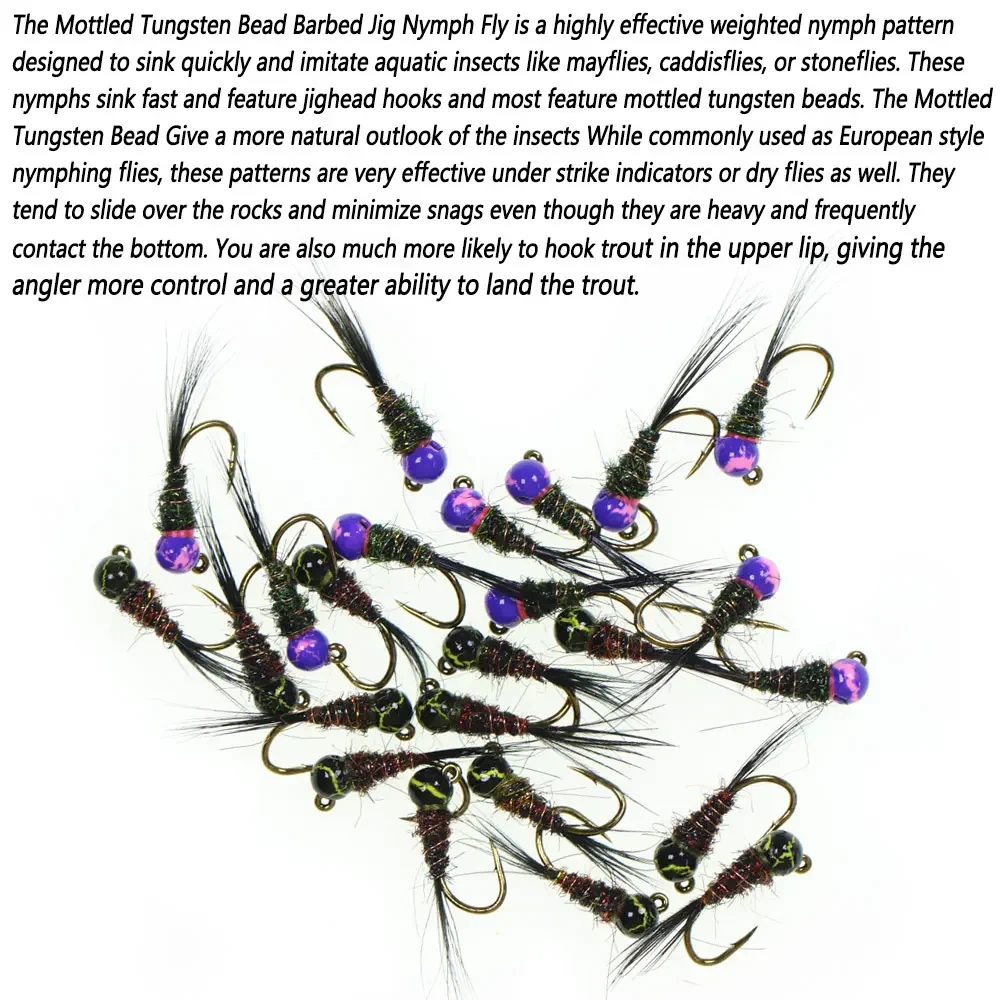 El Mottled Bead Jig Nymph Fly es un patrón de ninfa ponderado altamente efectivo diseñado para hundirse rápidamente e imitar insectos acuáticos como moscas, caddisflies o moscas de piedra.Estas ninfas se hunden rápidamente y cuentan con ganchos de cabeza blanda y la mayoría cuentan con cuentas de plantilla moteadas.La cuenta moleteada brinda una perspectiva más natural a los insectos. Si bien se usan como moscas de ninfas de estilo europeo, estos patrones también son muy efectivos bajo indicadores de golpe o moscas secas.Tienen a deslizarse sobre las rocas y minimizar los enganches aunque son pesados y entren en contacto frecuente con el fondo.También es mucho más probable que enganche la trucha en el labio superior, dando al pescador más control y una mayor capacidad para pescar la trucha.