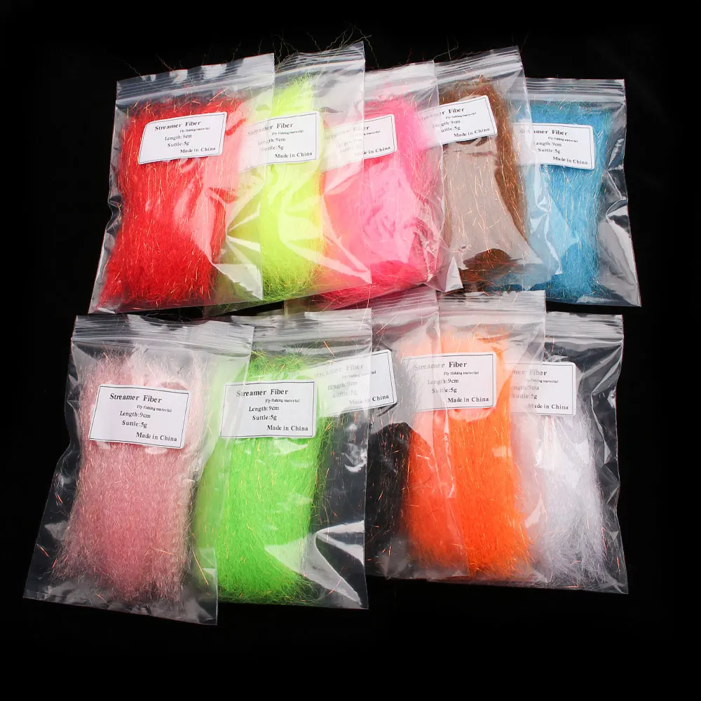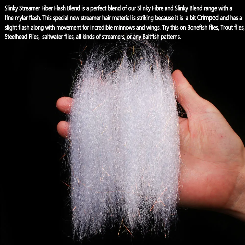 Slinky Streamer Fiber Flash Blend es una combinación perfecta de nuestra gama Slinky Fiber y Slinky Blend con un fino flash mylar.Este nuevo material especial para el cabello streamer es llamativo porque está un poco Crimpado y tiene un ligero destello junto con movimiento para increíbles pececillos y alas.Pruébelo en moscas de espina, moscas de trucha, moscas de cabeza de acero, moscas de agua salada, todo tipo de serpentinas o cualquier patrón de pez cebo.