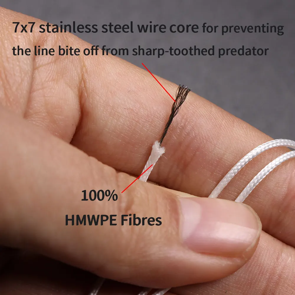- Trenza de PE de 16 hilos o línea trenzada Dyne-ma, con núcleo de alambre de acero 7*7 en el interior, evitando que la línea muerda al depredador de dientes afilados.