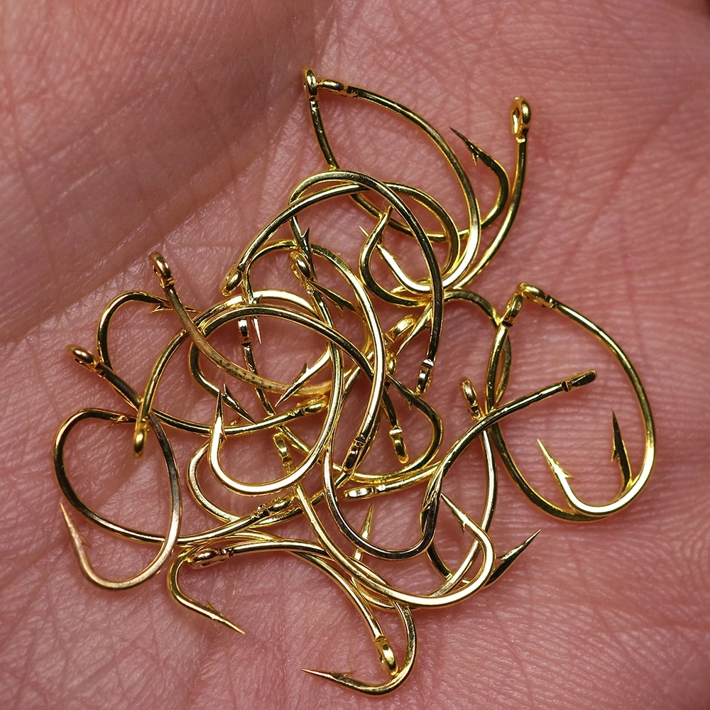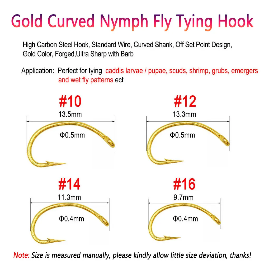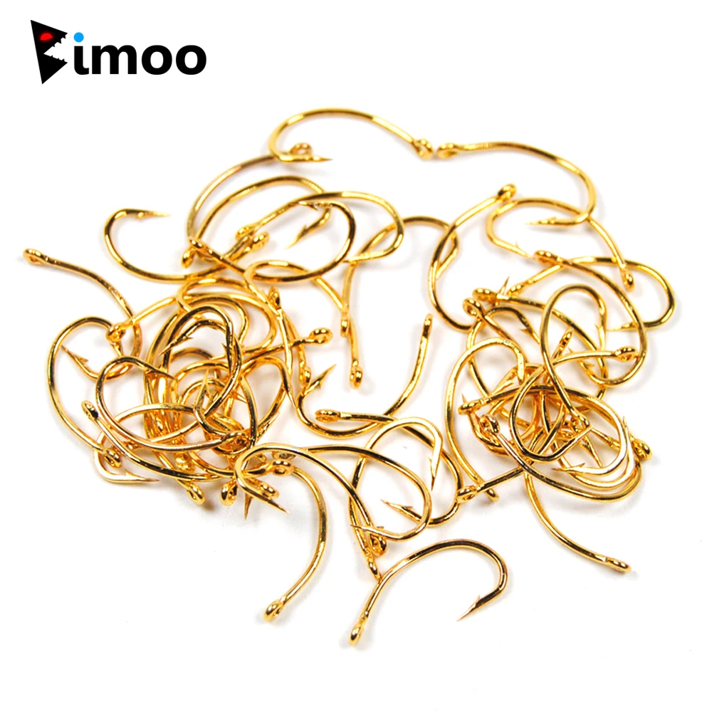 Bimoo 50 piezas 100 piezas#10#12#14#16 anzuelo dorado curvado para atar moscas Ninfa, escud, camarón, Pupae, larvas, Caddis, esmersiones, señuelo de pesca de trucha