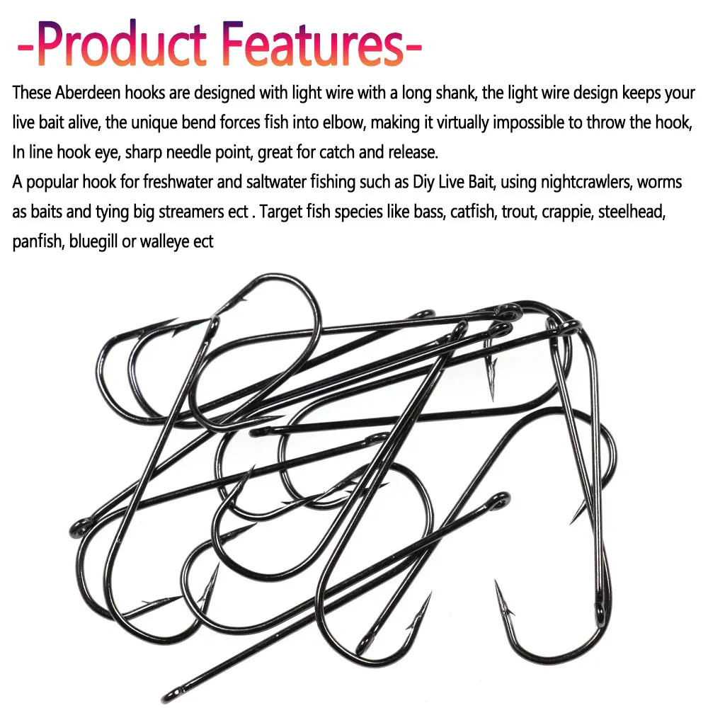 Estos anzuelos Aberdeen están diseñados con alambre liviano con un mango largo, el diseño de alambre liviano mantiene vivo su cebo vivo, la curva única fuerza a los peces hacia el codo, lo que hace prácticamente imposible lanzar el anzuelo, ojo del anzuelo en línea, punta de aguja afilada, excelente para pescar y soltar.