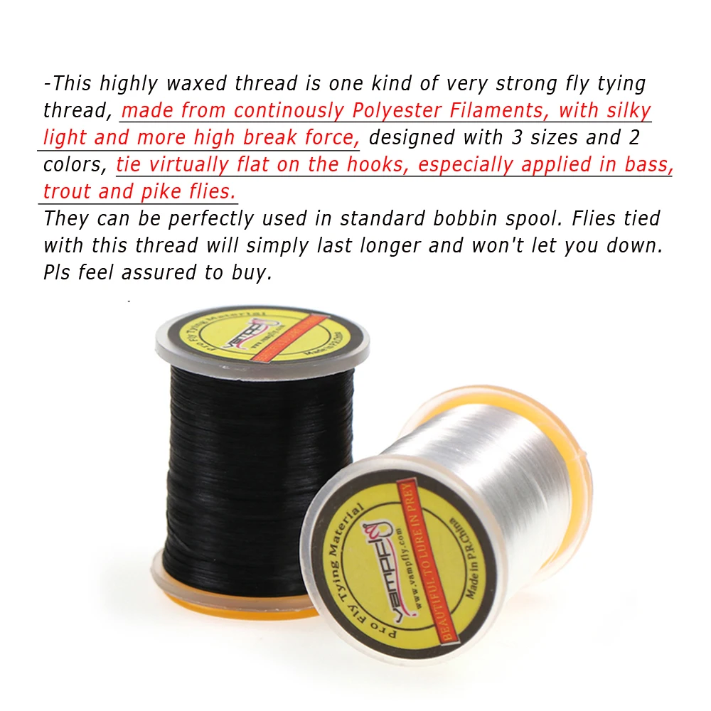 ---This highly waxed thread is one kind of very strong fly tying thread, made from continously Polyester Filaments, with silky light and more high break force, designed with 3 sizes and 2 colors, tie virtually flat on the hooks, especially applied in bass, trout and pike flies.