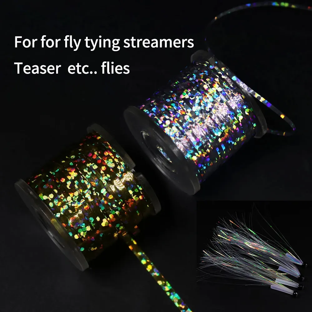Bimoo 200 yardas/carrete 0,5mm-2,5mm Fly Tying Tinsel Flash Tape Pearl Holographic Streamer Teaser Fly Tying Material