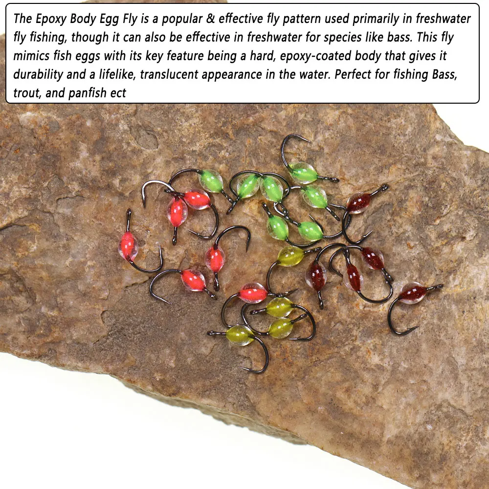 El Epoxy Body Egg Fly es un patrón de mosca popular y eficaz que se utiliza principalmente en la pesca con mosca de agua dulce, aunque también puede ser eficaz en agua dulce para especies como el lubina.Esta mosca imita huevos de pescado con su característica clave siendo un cuerpo duro recubierto de epoxi que le da durabilidad y una apariencia realista y translúcida en el agua.Perfecto para pescar lubina, trucha y panfish, etc.