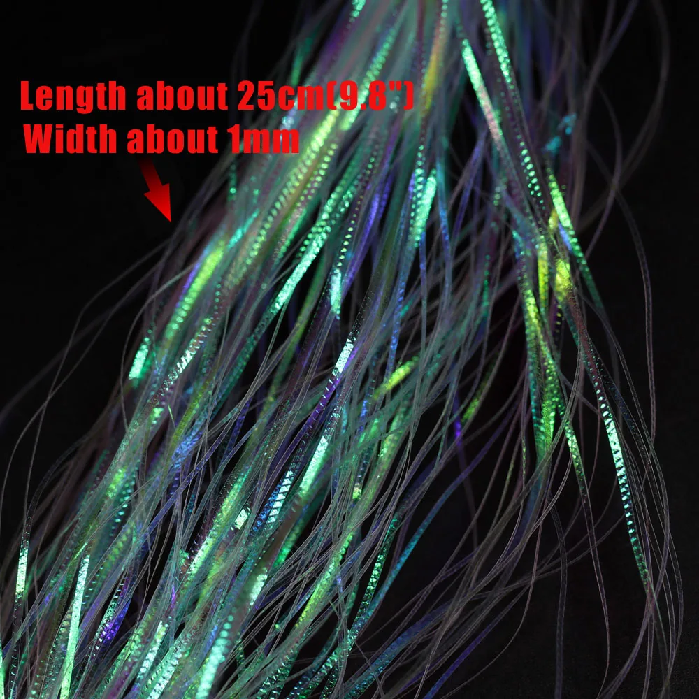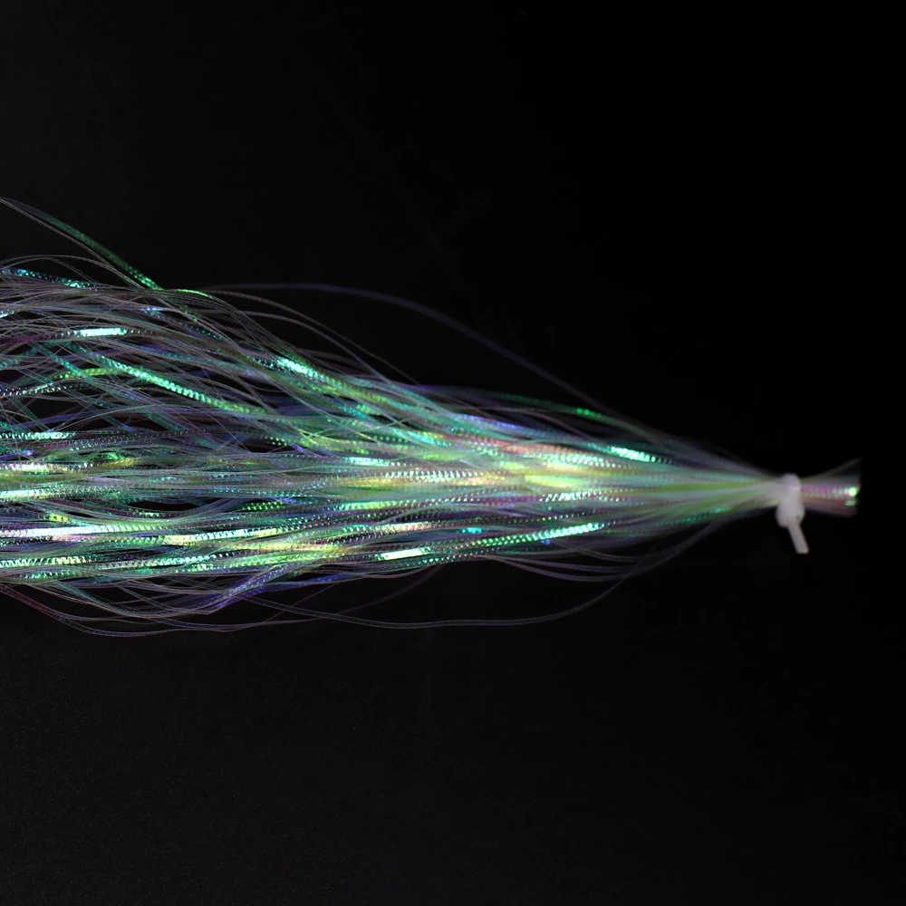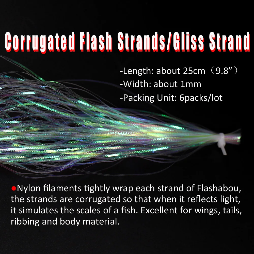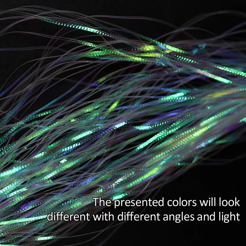 ● Características: los filamentos de nailon envuelven firmemente Cada hebra de flashabú, las hebras son corrugadas de modo que cuando refleja la luz, simula las escamas de un pez. Excelente para alas, colas, ribbing y material corporal.