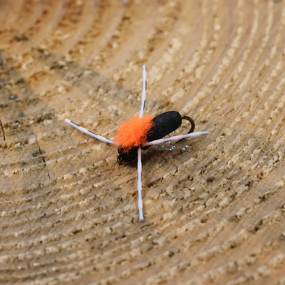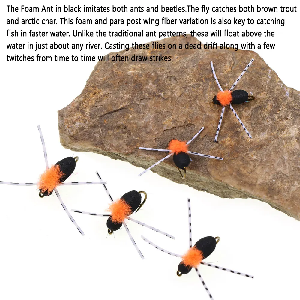 La Formiga Espuma en color negro imita tanto a hormigas como a escarabajos. La mosca atrapa truchas marrones como caratriz ártico.Esta variación de fibra de espuma y poste de ala también es clave para capturar peces en aguas más rápidas.A diferencia de los patrones tradicionales de hormigas, estos flotarán sobre el agua en casi cualquier río.Lanzar estas moscas en una deriva muerta junto con algunos movimientos de vez en cuando a menudo atraerá golpes.