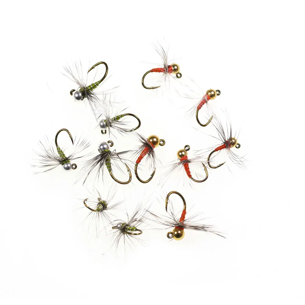 Bimoo 6pcs #12 #14 #16 Tungsten Bead Head Grizzly Hackle Jig Nymph Fly Fast Sinking Barbed Worm Fly Wet Euro Nymph Fly Trout Fishing Lures