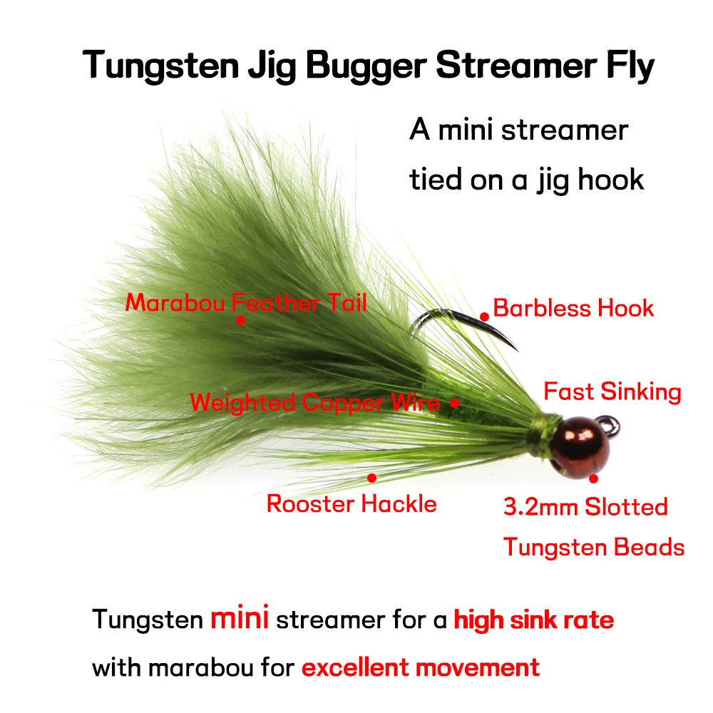 Mini streamer de bugger Tungsten Jig para una alta tasa de hundimiento con marabú para un excelente movimiento.Gira esta mini serpentina debajo de un indicador o tira lentamente como lo haría con otras serpentinas.Las cuentas de tungsteno son muy buscadas por los entusiastas de la ninfa por su peso más pesado y su capacidad para conducir las ninfas hasta el fondo rápidamente.Junto con el anzuelo sin barblas, estas moscas con cuentas de tungsteno son una combinación de mosca mortal.Es un patrón popular y ampliamente utilizado tanto para peces de caza de agua dulce como salada y generalmente aparece como uno de los patrones superiores para tener en cualquier caja de moscas.