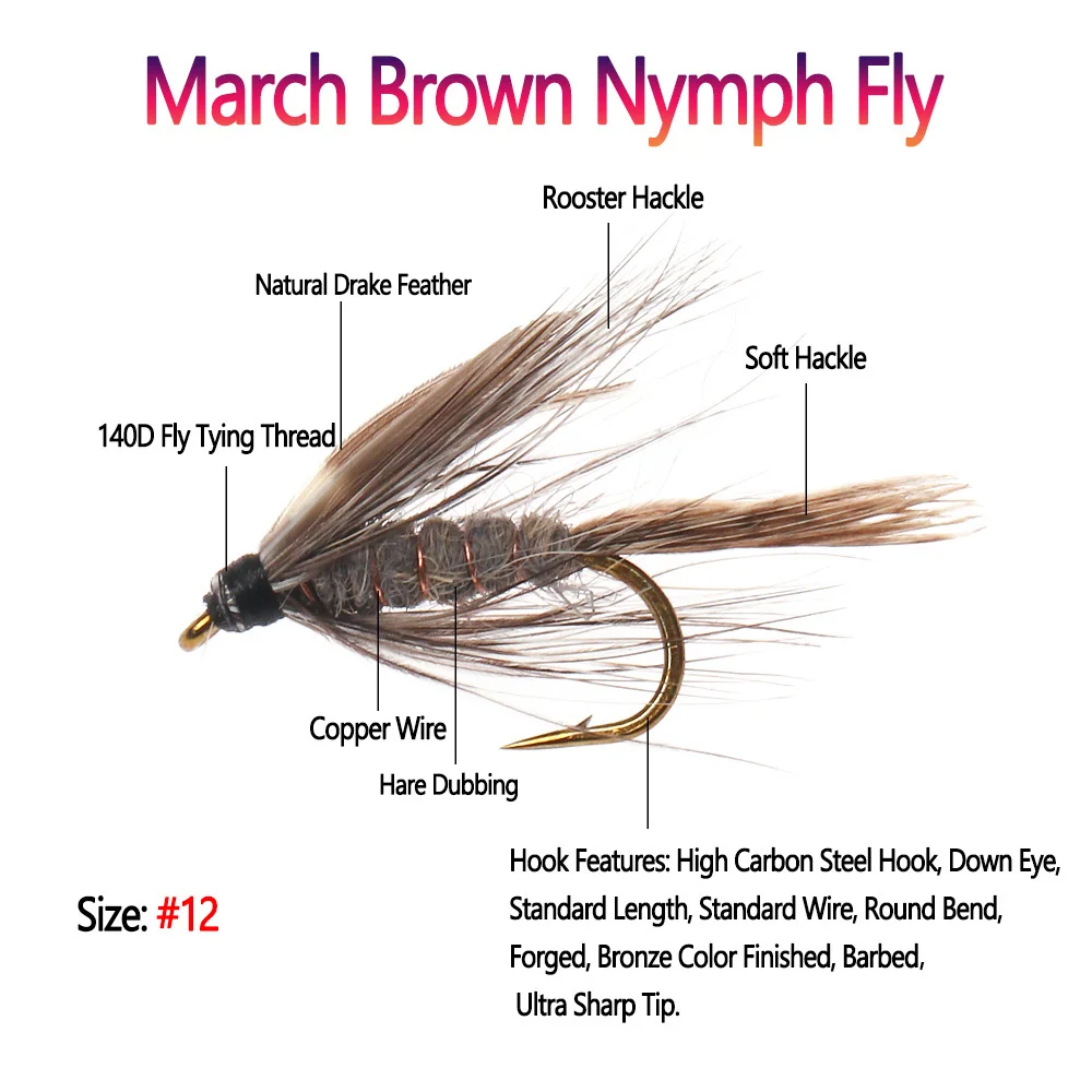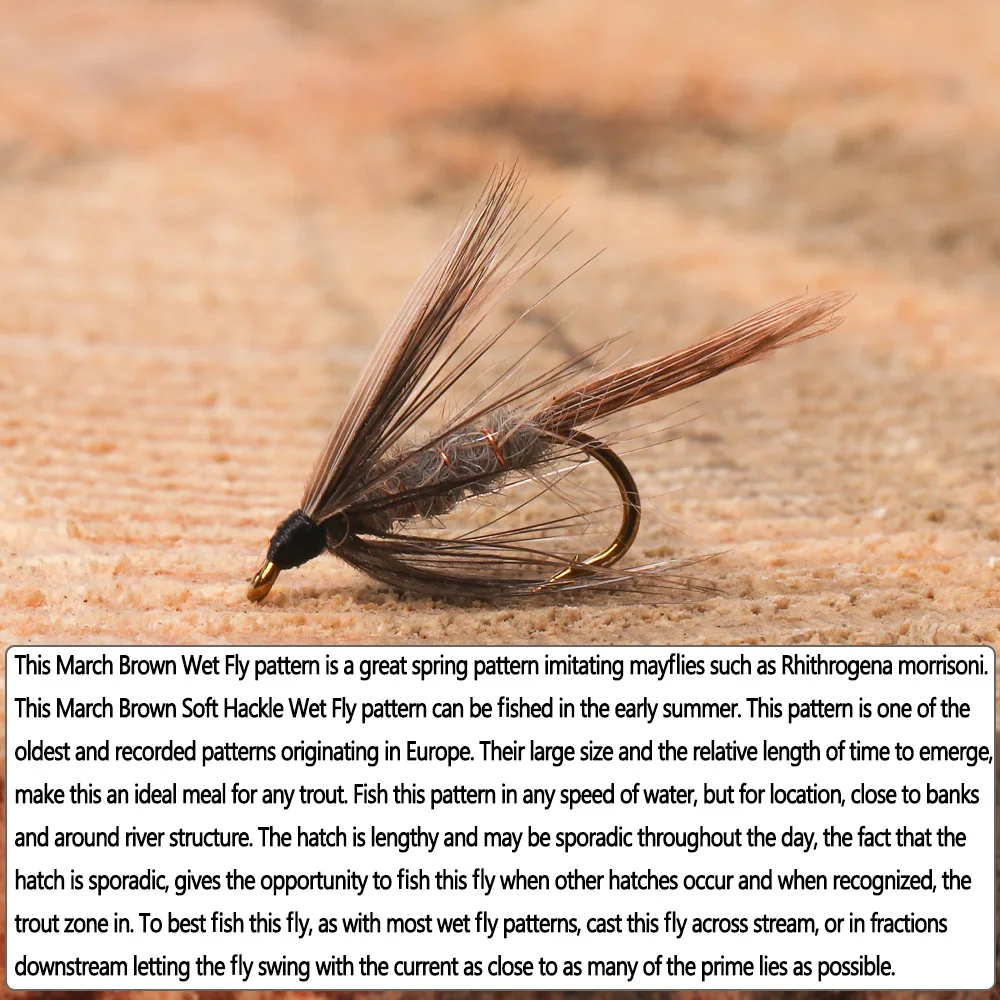 Este patrón de mosca mojada marrón de Marzo es un gran patrón de primavera que imita a las moscas de mayo como Rhithrogena morrisoni. Este patrón de mosca mojada suave marrón de marzo se puede pescar a principios del verano. Este patrón es uno de los patrones más antiguos y registrados originarios de Europa. Su gran tamaño y El tiempo relativo para salir, hacen de esta una comida ideal para cualquier trucha. Busque este patrón en cualquier velocidad del agua, pero para la ubicación, cerca de las orillas y alrededor de la estructura del río. La escotilla es larga y puede ser esporádica durante todo el día, el hecho de que la escotilla sea esporádica, da la oportunidad de pescar esta mosca cuando se producen otras escotillas y cuando se reconoce, la zona de trucha entra. Para pescar mejor esta mosca, como con la mayoría de los patrones de moscas húmedas, Lance esta mosca a través del arroyo, o En fracciones aguas abajo, dejando que la mosca oscile con la corriente lo más cerca posible de muchas de las mentiras principales.
