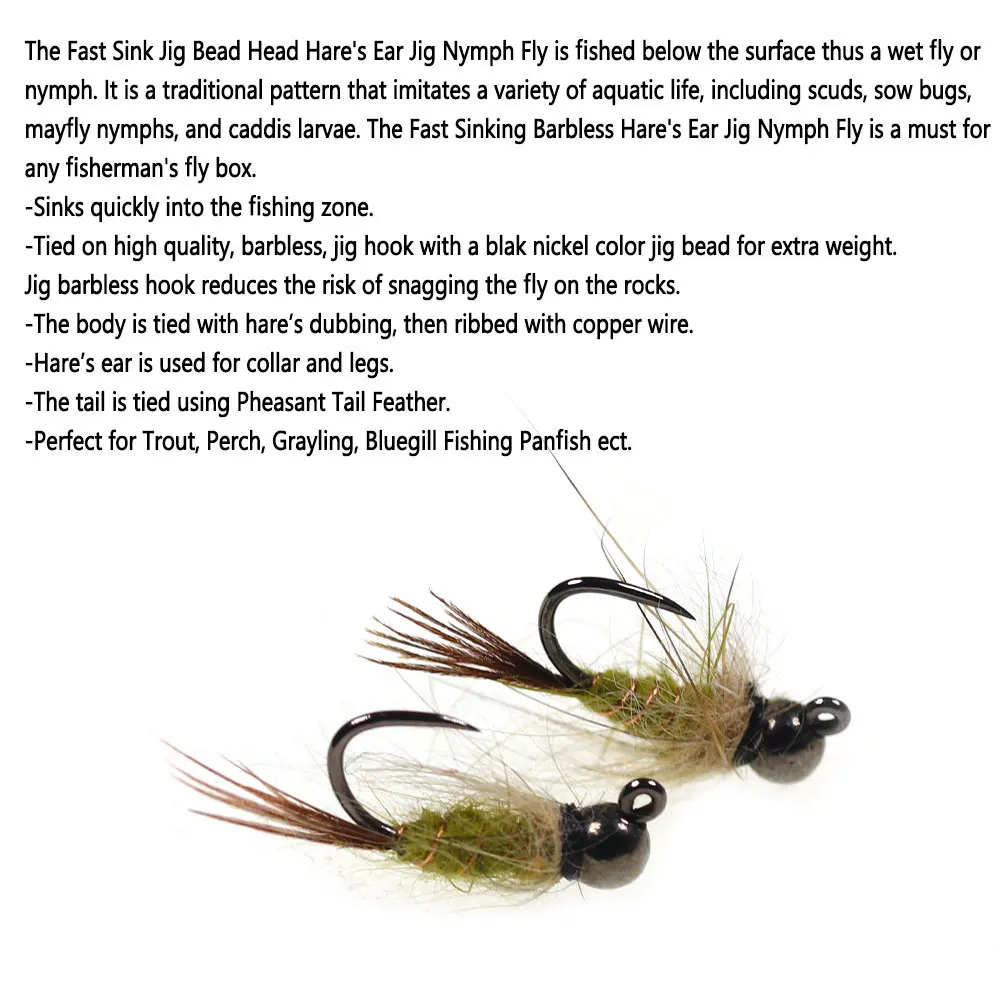 La Weighted Jig Bead Head Hare's Ear Jig Nymph Fly se pesca debajo de la superficie, por lo que una mosca mojada o una ninfa.Es un patrón tradicional que imita una variedad de vida acuática, que incluyen scuds, insectos de siembra, ninfas de mosca y larvas de caddis.El Jig Bead Head Hare's Ear Jig Nymph Fly es imprescindible para la caja de moscas de cualquier pescador.
