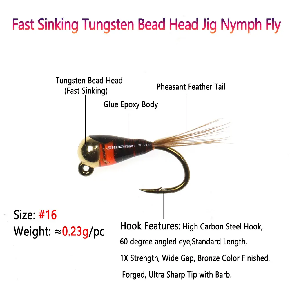 Bimoo 6 piezas#16 plantilla de cabeza de cuentas de tungsteno ninfa mosca epoxi cuerpo Pheasant cola fregadero rápido barbilla húmeda ninfa Euro mosca truta Señuelos de pesca