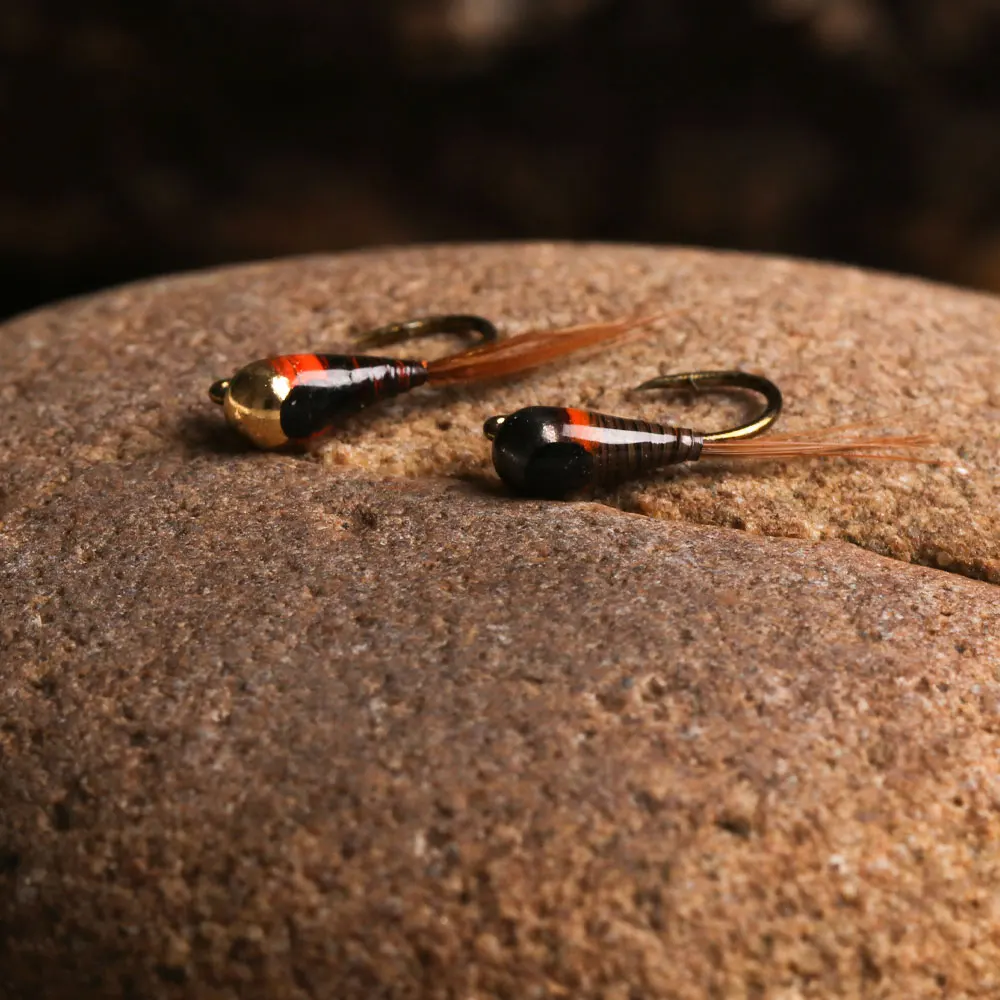 El nuevo desarrollo de las ninfas de plantilla con cabeza de cuentas de tungsteno está atado al anzuelo. ¡Estas ninfas permanecerán en el agua con la punta del anzuelo en la posición superior!Significa menos enganches, una mejor presentación la mosca permanecerá en su mayoría más paralela en comparación con la ninfa clásica presentada casi perpendicular en el fondo del río.La posición es más anatómica y cercana a las posiciones de natación de los insectos.Otra gran ventaja cuando usas ninfas jig es que el pescador puede detectar mejor el fondo del río porque la cuenta tocará las rocas y no el cuerpo o la punta del anzuelo en el estuche con ninfas atadas con ganchos clásicos.Estas moscas con cabeza de cuentas y con peso son ideales para arroyos rápidos y ríos más pequeños.También son excelentes a un nivel de agua más alto y en aguas oscuras.