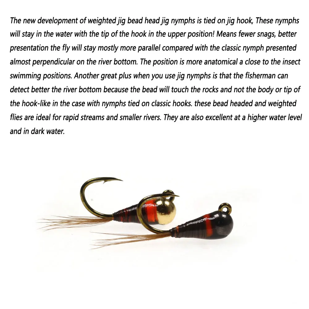 The new development of weighted Jig bead head jig nymphs is tied on jig hook, These nymphs will stay in the water with the tip of the hook in the upper position! Means fewer snags, better presentation the fly will stay mostly more parallel compared with the classic nymph presented almost perpendicular on the river bottom. The position is more anatomical a close to the insect swimming positions. Another great plus when you use jig nymphs is that the fisherman can detect better the river bottom because the bead will touch the rocks and not the body or tip of the hook-like in the case with nymphs tied on classic hooks. these bead headed and weighted flies are ideal for rapid streams and smaller rivers. They are also excellent at a higher water level and in dark water.