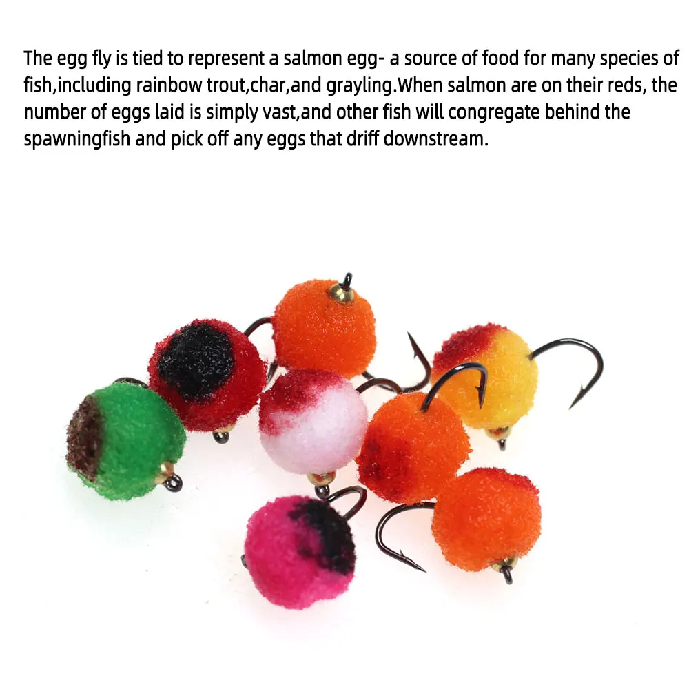 La mosca del huevo está atada para representar un huevo de salmón, una fuente de alimento para muchas especies de peces, incluidas la trucha arcoíris, el agua y el aseo.Cuando el salmón está en sus enrojecimientos, la cantidad de huevos colocados es simplemente vasta, y otros peces se combinarán detrás de los peces voladores y recogerán los huevos que se bajen a la corriente.