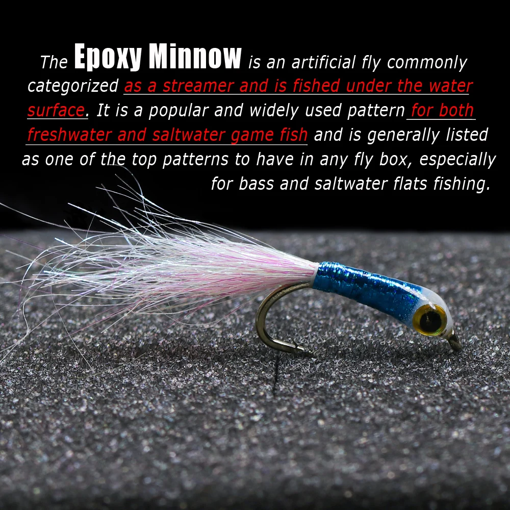 ------La Epoxy Minnow es una mosca artificial comúnmente clasificada como serpentina y se pesca bajo la superficie del agua.Es un patrón popular y ampliamente utilizado tanto para peces de caza de agua dulce como de agua salada y generalmente aparece uno de los patrones superiores para tener en cualquier caja de moscas, especialmente para la pesca de lubina y agua salada.