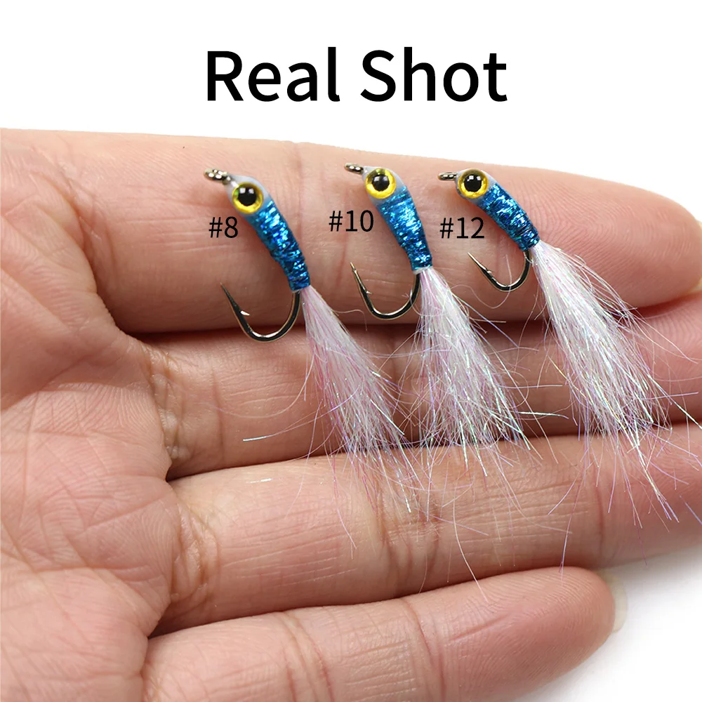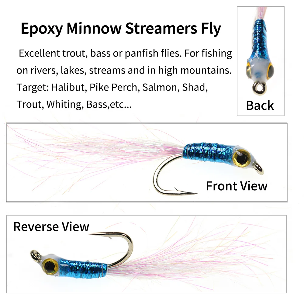 Bimoo 6 PCS/Box Epoxy Minnow Streamer Fly #8 #10 #12 Blue Flash Gliss Body Ice Doblaje Cola Trucha Bass Perch Jig Lure Bait