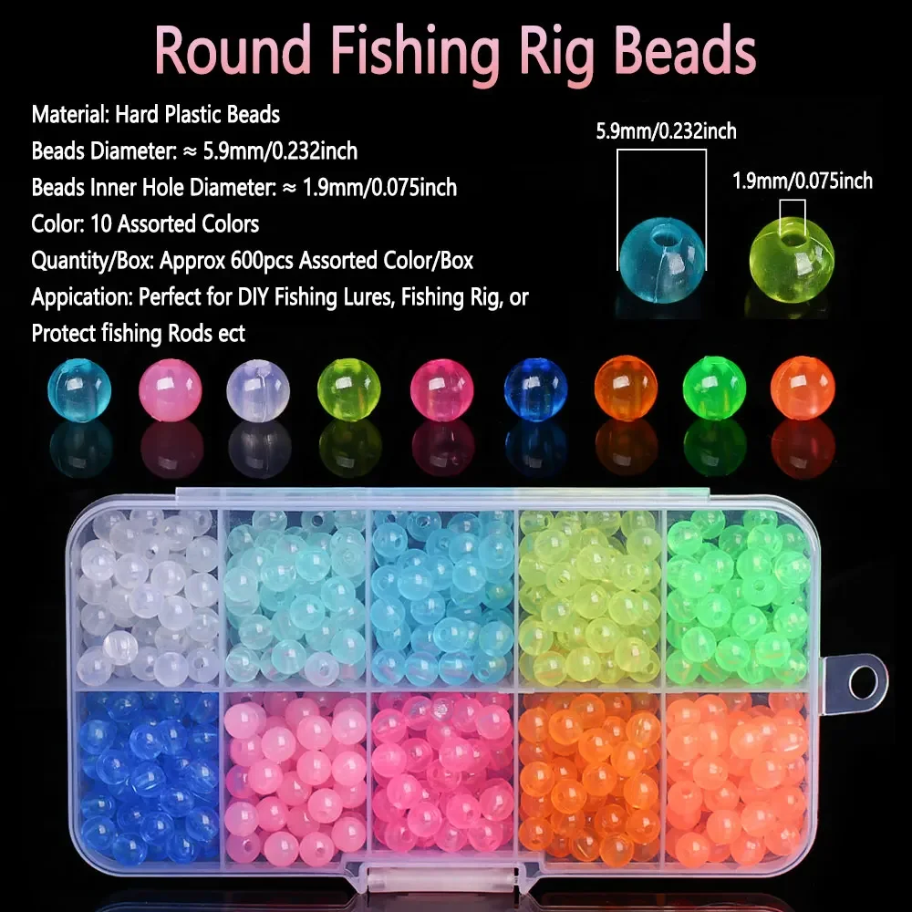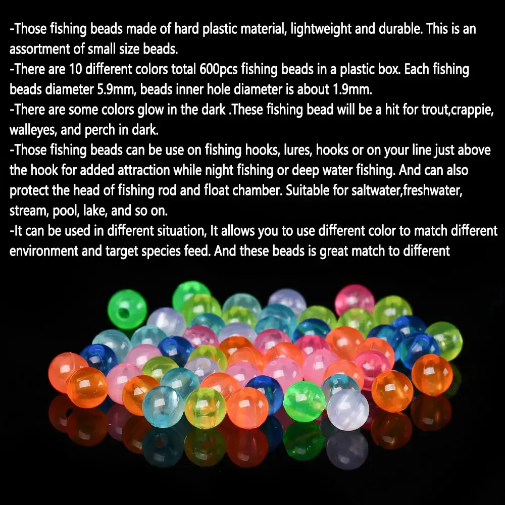 -Hay 10 colores diferentes en un total de 600 cuentas de pesca en una caja de plástico.Cada perla de pesca tiene un diámetro de 5,9 mm y el diámetro del orificio interior de las cuentas es de aproximadamente 1,9 mm.