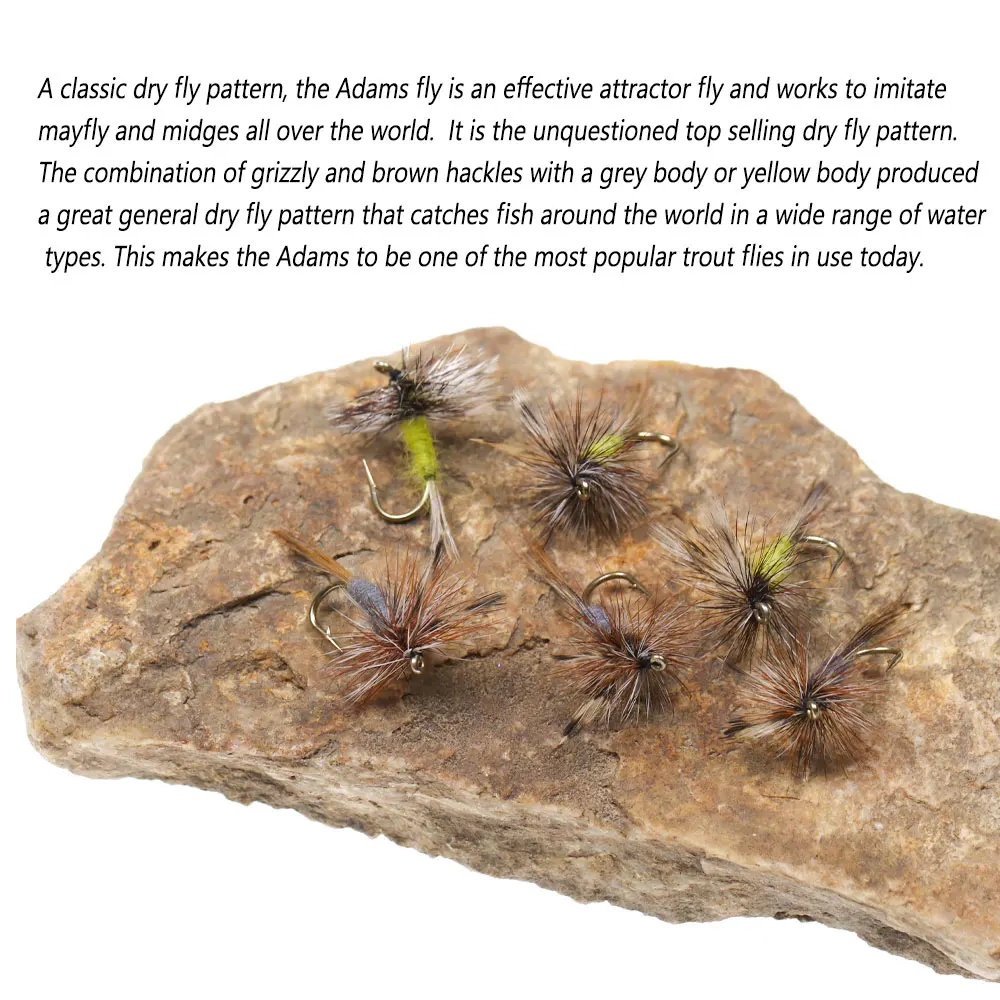 Mayfly y midges en todo el mundo.Es el patrón de moscas secas más vendido sin preguntas. La combinación de los hackles grizzly y marrones con un cuerpo gris o amarillo produjo un excelente patrón de moscas secas en general que atrapa peces de todo el mundo en una amplia gama de tipos de agua.Esto hace que el Adams sea una de las moscas de trucha más populares que se utilizan en la actualidad.