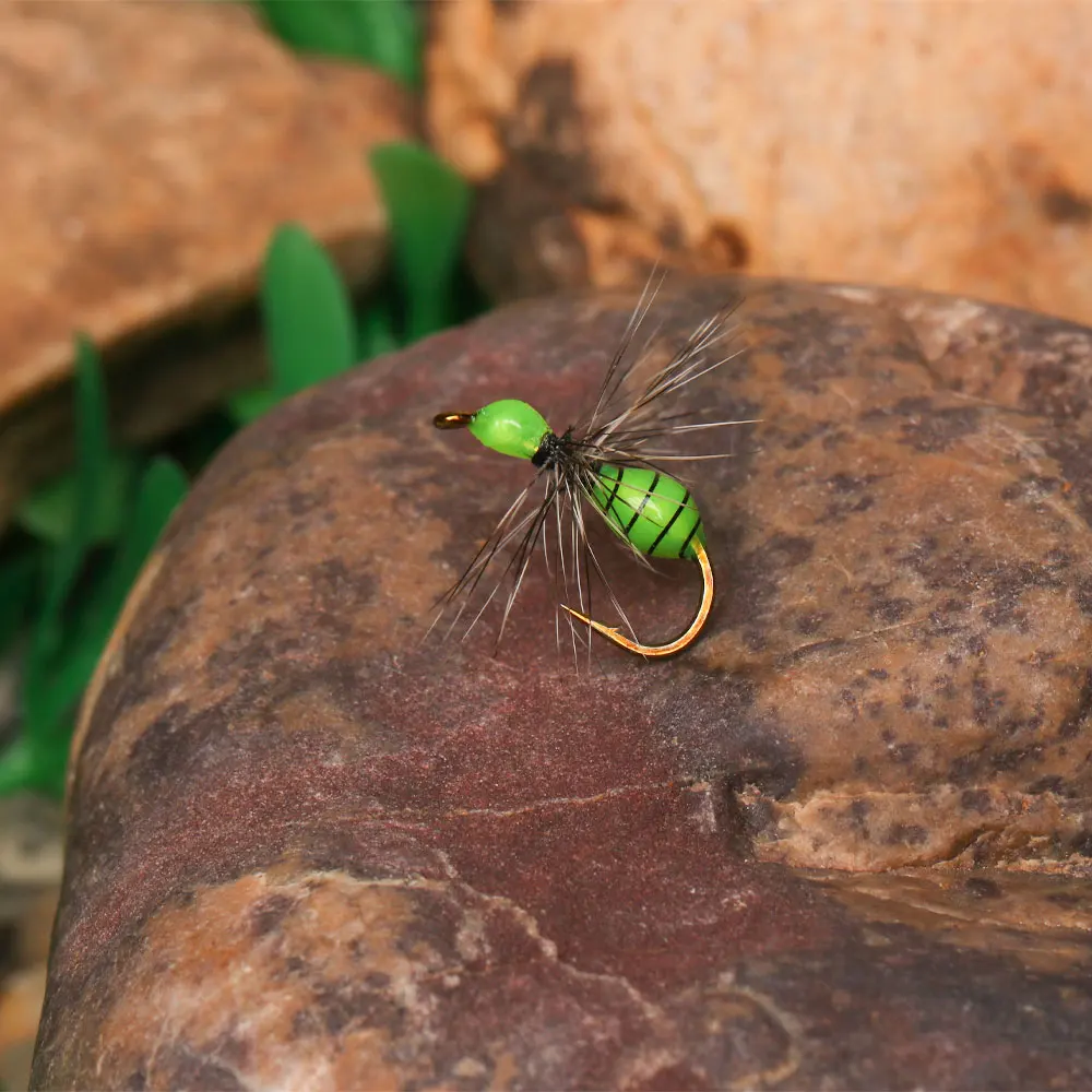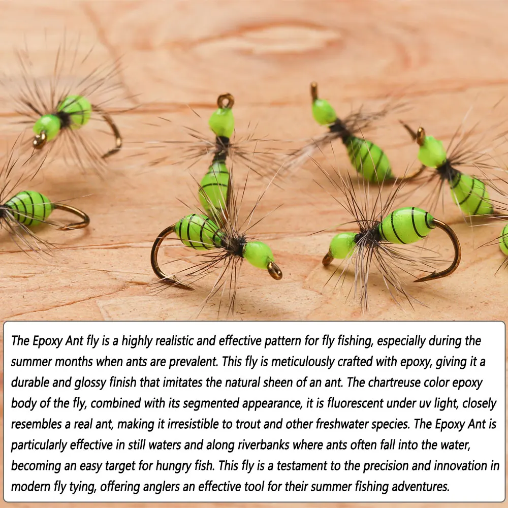 La mosca de hormigas epoxi es un patrón muy realista y eficaz para la pesca con mosca, especialmente durante los meses de verano en los que prevalecen hormigas.Esta mosca está meticulosamente elaborada con epoxi, lo que le da un acabado duradero y brillante que imita el brillo natural de una hormiga.El cuerpo de la mosca epoxi de color chartreuse, combinado con su apariencia segmentada, es fluorescente bajo luz ultravioleta, se asemeja estrechamente a una hormiga real, lo que la hace irresistible para truchas y otras especies de agua dulce.La hormiga epoxi es particularmente eficaz en aguas quietas y a lo largo de las orillas de río donde las hormigas suelen caer en el agua, convirtiéndose en un objetivo fácil para los peces hambrientos.Esta mosca es un testimonio de la precisión y la innovación en la atadura de moscas moderna, ya que ofrece a los pescadores una herramienta eficaz para sus aventuras de pesca de verano.