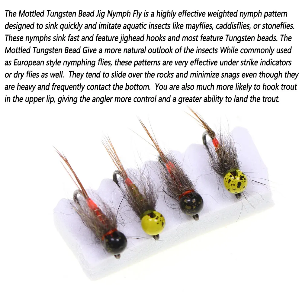 El jig de cuentas de tungsteno molido Nymph Fly es un patrón de ninfas ponderado altamente efectivo diseñado para hundirse rápidamente e imitar insectos acuáticos como moscas, caddisflies o moscas de piedra.Estas ninfas se hunden rápidamente y cuentan con ganchos de cabeza plana y la mayoría cuentan con cuentas de tungsteno.La cuenta de tungsteno molido brinda una perspectiva más natural a los insectos. Si bien se usan comúnmente como moscas de ninfas de estilo europeo, estos patrones también son muy efectivos bajo indicadores de golpe o moscas secas.Tienen a deslizarse sobre las rocas y minimizar los enganches aunque son pesados y entren en contacto frecuente con el fondo.También es mucho más probable que enganche la trucha en el labio superior, dando al pescador más control y una mayor capacidad para pescar la trucha.